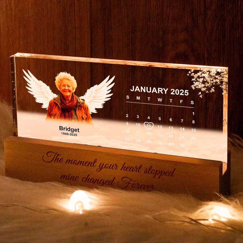 Honor the cherished memory of a loved one with this personalized photo LED night light,featuring a custom photo and a calendar marking.