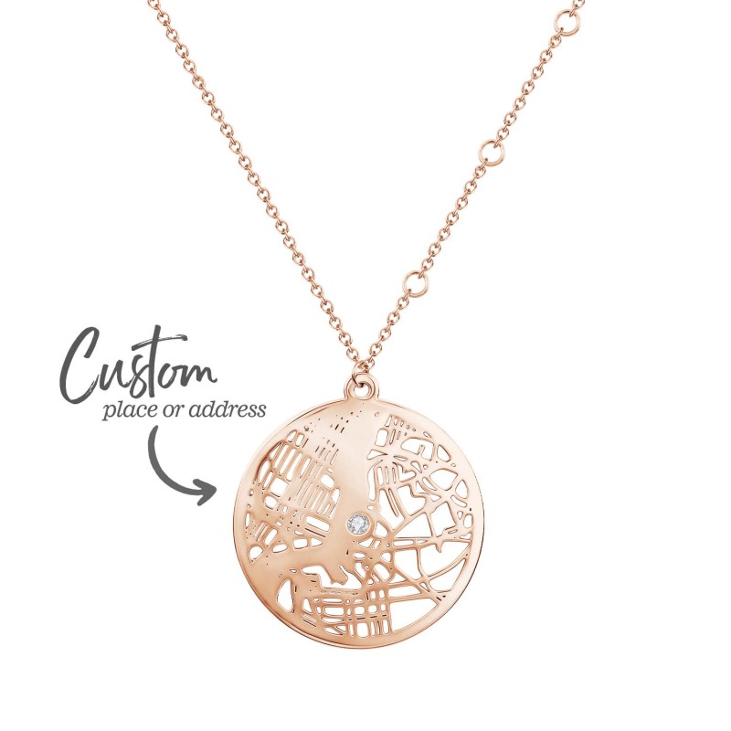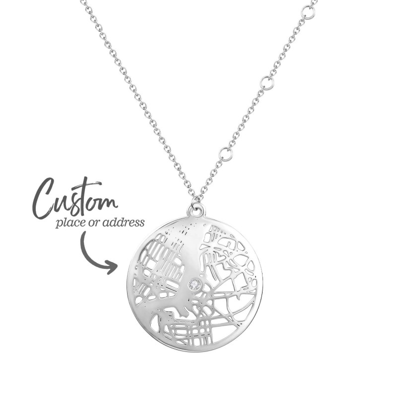 Capture memories from your special places with our Custom Round Map Necklace. This romantic charm traces a personalized map outline inside a heart, turning your favorite moments into wearable art. Choose from three chain styles-Plain, Cross, or Projection Bead-to suit her style, and add a touch of sparkle with optional gemstones for an extra romantic glow. Perfect as an anniversary gift or a thoughtful surprise for her, this necklace is a timeless keepsake she’ll treasure.