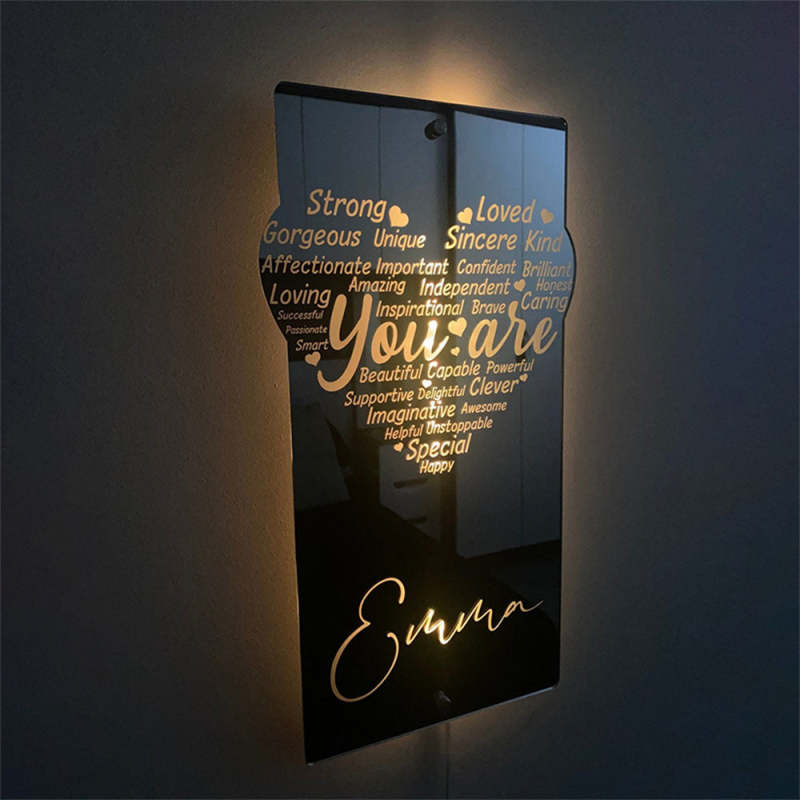 What’s in the box:Personalised name mirror with LED lighting, made from lightweight, shatterproof acrylic. Includes remote control and wall mounting stand-offs.