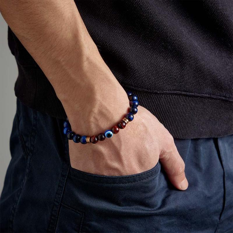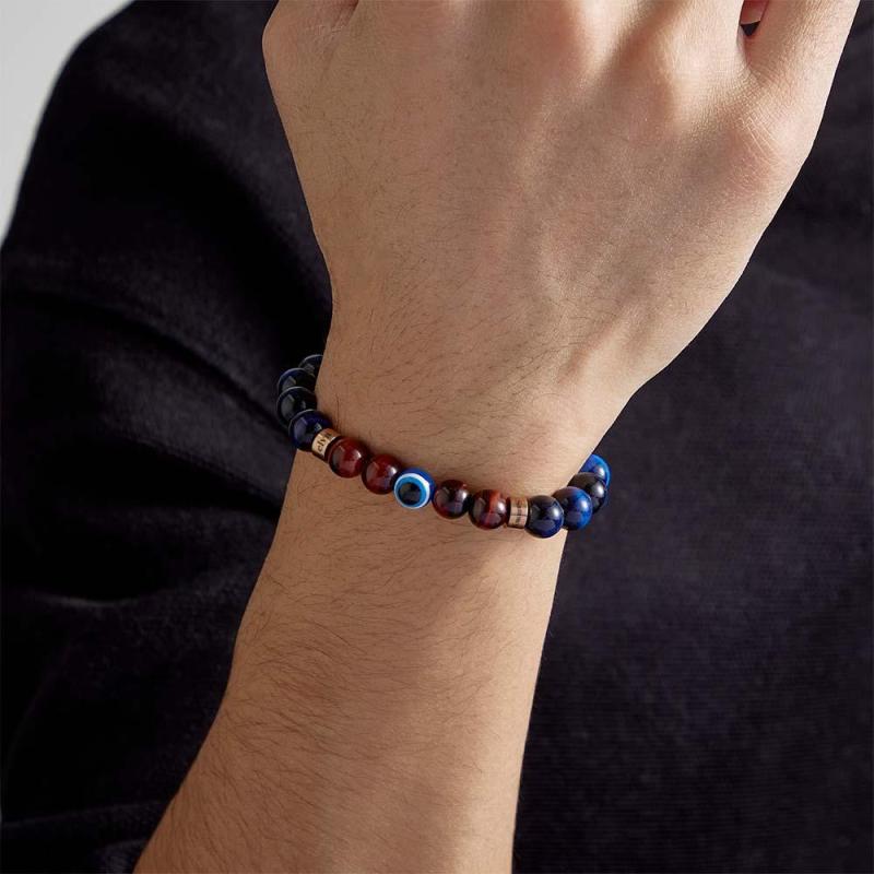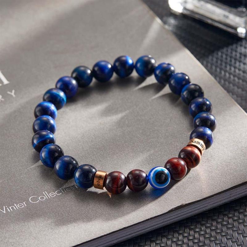 Custom Engraved Amulet Bracelet Evil Eye Blue and Red Tiger Eye Beaded Bracelet for Men