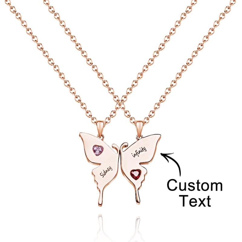 Custom Engraved Butterfly Necklace With Heart Birthstone Double Chains Creative Gifts For Sisters