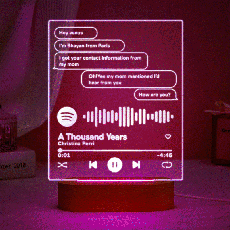 Custom engraved 7 colors lamp, you can choose any song title, artist name, and favorite photos you want, all can be imprinted on the plaque, and you can generate a unique Spotify code. Please note that the plaque itself does not emit music. You have to scan the code on the Spotify app, after scanning the code on Spotify, your song will start playing immediately. The perfect gift for family and friends of all ages, share this unique gift with your loved ones and enjoy the experience together.
