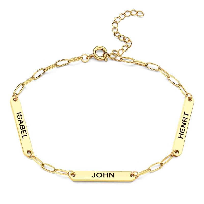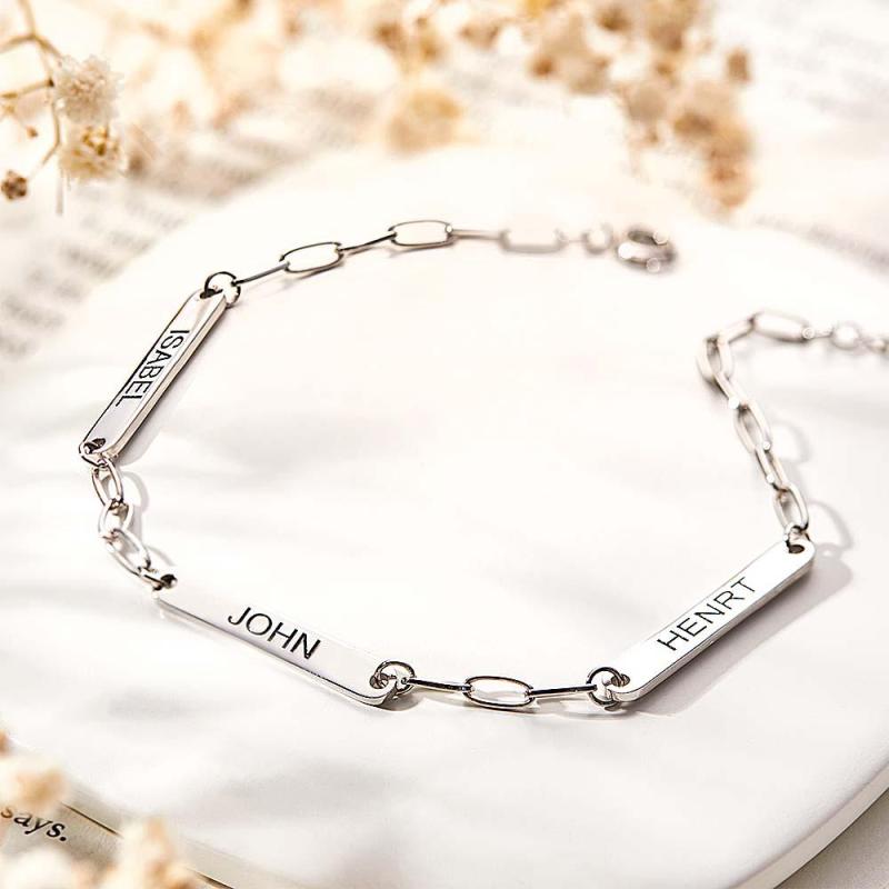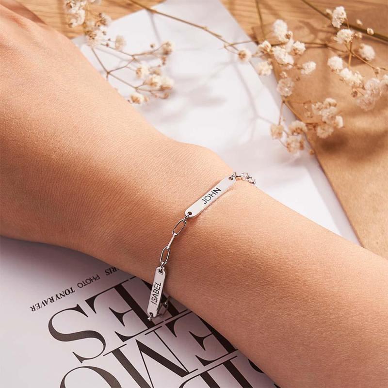 Personalize this bar bracelet with any names or words that are special to you. The paperclip bracelet chain can be accented with multiple charms to create the perfect customized gift.