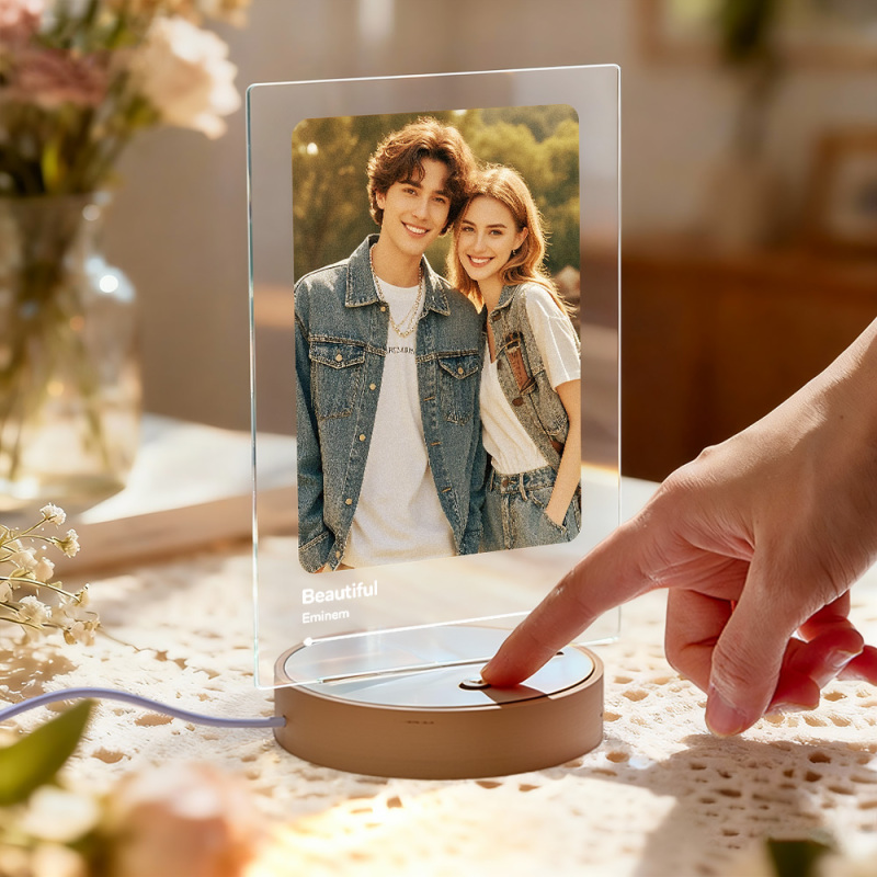 Forget QR codes and apps - this is a new level of personalization. With just one press of a button on the wooden base, your chosen song begins to play, and the soft lighting turns on. It’s not just decor - it’s your memory, your song, and your love, captured forever in sound and light.