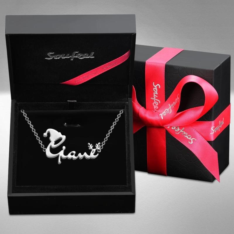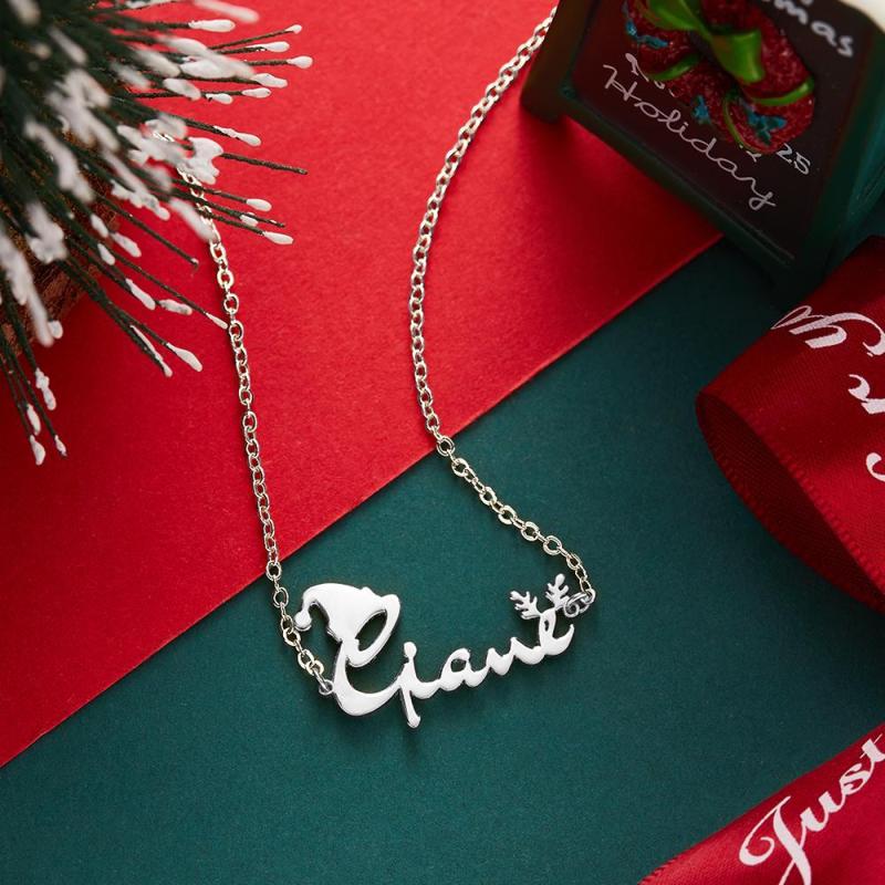 Custom Name Necklace with Christmas Hat and Antlers Perfect Gift Christmas Gifts Silver