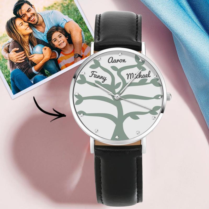 Custom Name Watch Black Leather Strap 40mm for Family (1-9 Names)