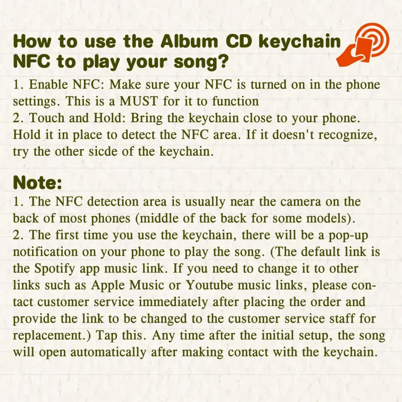 2. The first time you use the keychain, there will be a pop-up notification on your phone to play the song. (The default link is the Spotify app music link. If you need to change it to other links such as Apple Music or Youtube music links, please contact customer service immediately after placing the order and provide the link to be changed to the customer service staff for replacement.) Tap this. Any time after the initial setup, the song will open automatically after making contact with the keychain.