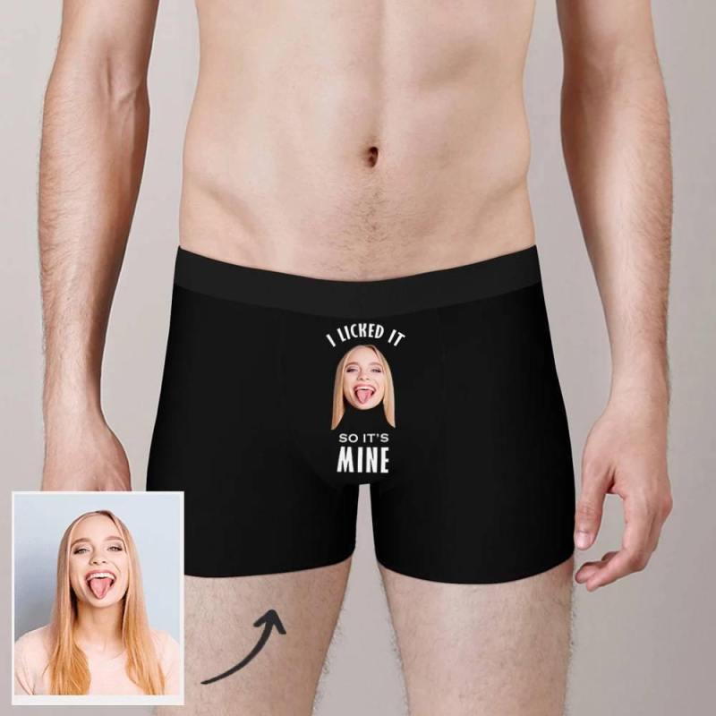 This novelty boxer makes the unique present idea for your friend, father, husband, son, grandfather, fiance, brother, boyfriend and yourself. Looking for a gift for birthday, anniversary, graduation, Valentine's Day? Using your picture to make this funny custom underwear, it only design for you, lovely gift choice for all of you, small print pattern together with your picture, so lovely and meaningful gift for your loved one. Here is a fantastic and interesting way to make a difference in your life, which is to put the photo of the person who is special for you on underwear, we provide both men's custom boxers and women's custom panties! It is a great way to promote feelings between you and your lover. Custom Photo Boxer Licked It So It's Mine - Man.