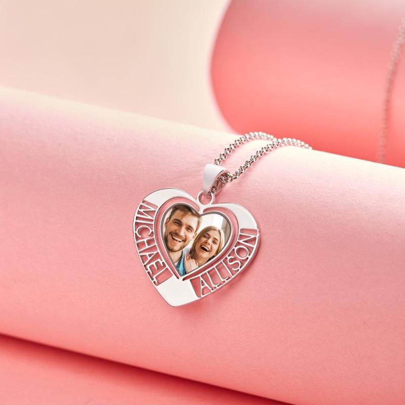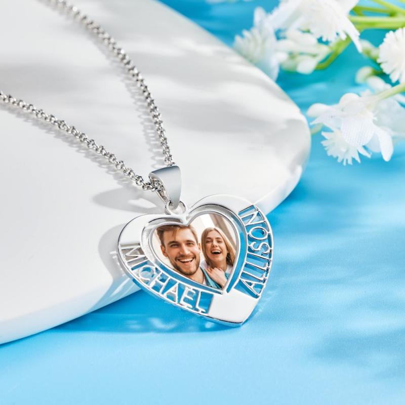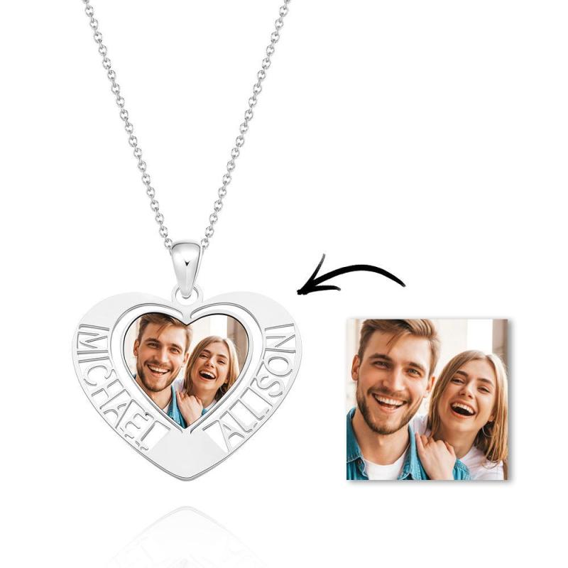 Custom Photo Engraved Necklaces Heart Photo Pendant with Two Hollow Lettering