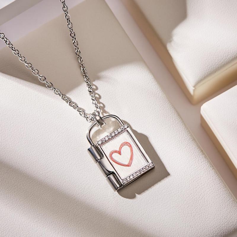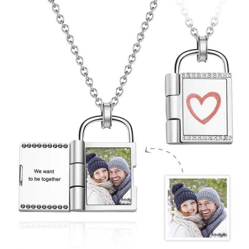 Custom post picture engraving print frame padlock necklace gift to her. The necklace is shaped like an album in which you can customize text and a photo. This necklace has three colors to choose from, you can choose a color you like customized for your girl.