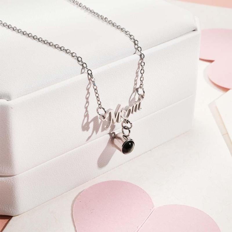 A special projection necklace, this necklace has a projection function and is paired with a "MOM" pendant. Simply hold the pendant up to a light source, and it will project the photo. It is very suitable as a Mother's Day or birthday gift to express your love and gratitude to your mother.