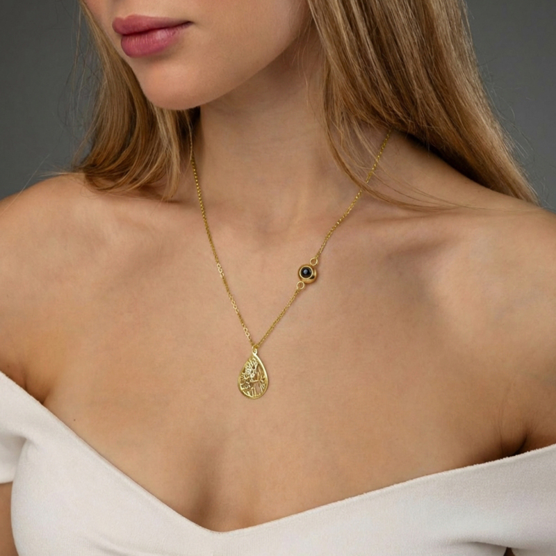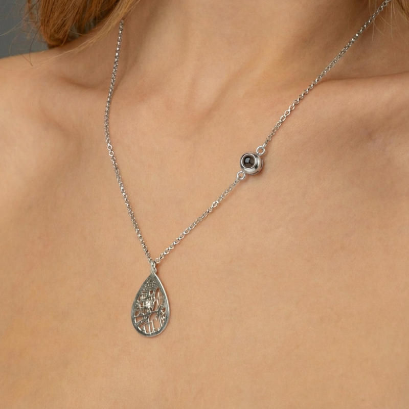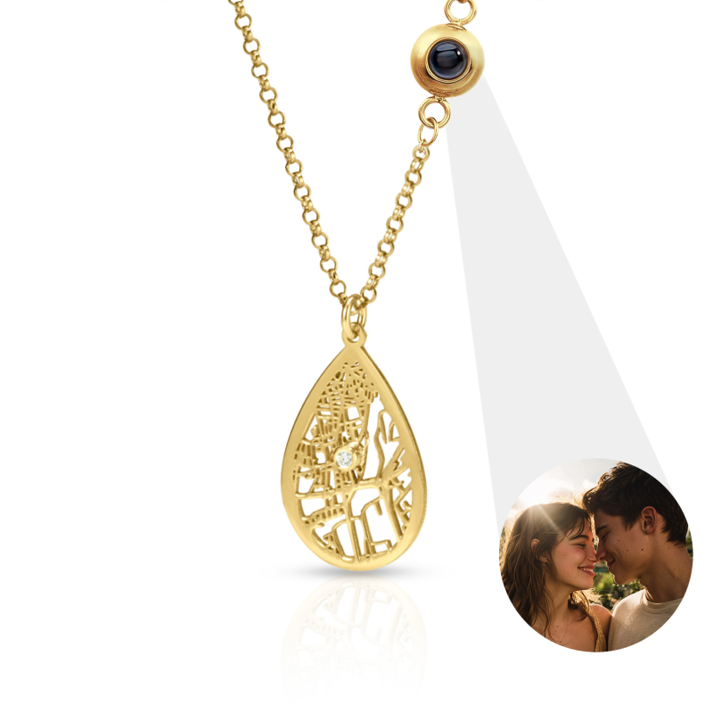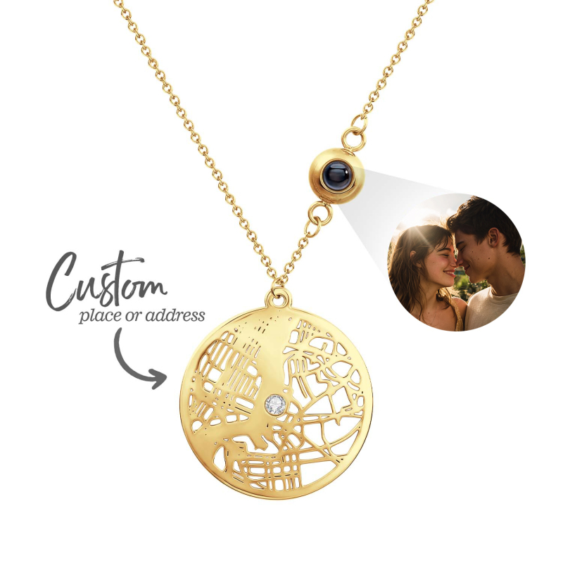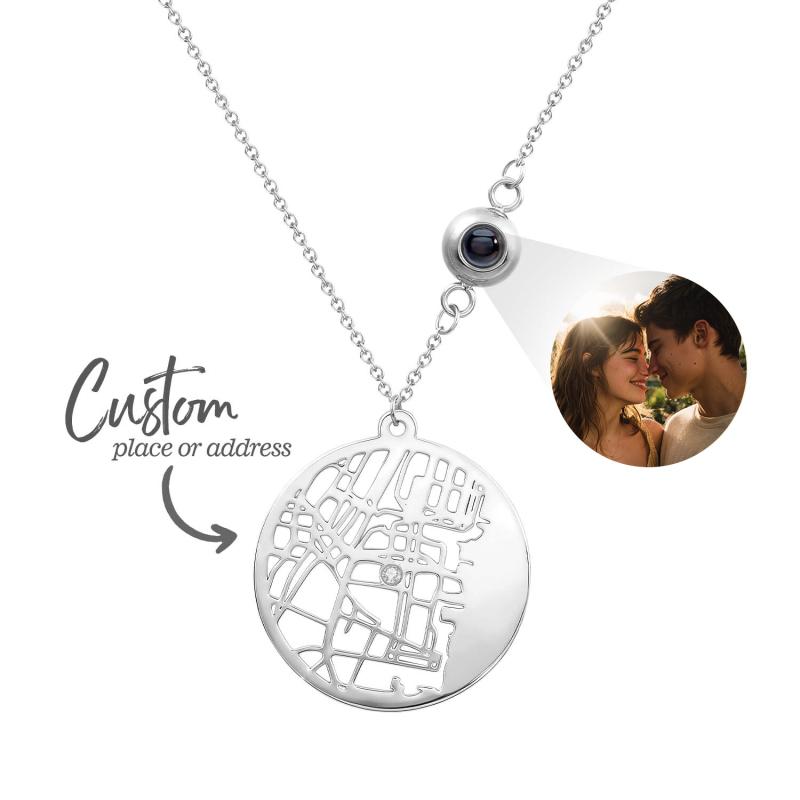 Capture memories in style with our Custom Photo Projection Necklace. This heartfelt piece features a discreet projection charm that displays a treasured photo when worn, turning everyday moments into a personal keepsake. The Cherished Spot Map design adds a meaningful touch by marking a special location, enhanced with a gemstone accent for a touch of elegance. Perfect as an Anniversary Gift or a thoughtful present for her, this necklace combines sentiment and sophistication.