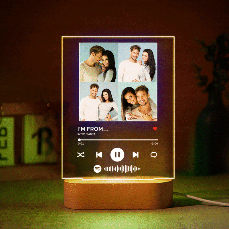 Custom engraved 7 colors lamp, you can choose any song title, artist name, and favorite photos you want, all can be imprinted on the plaque, and you can generate a unique Spotify code. Please note that the plaque itself does not emit music. You have to scan the code on the Spotify app, after scanning the code on Spotify, your song will start playing immediately. The perfect gift for family and friends of all ages, share this unique gift with your loved ones and enjoy the experience together.