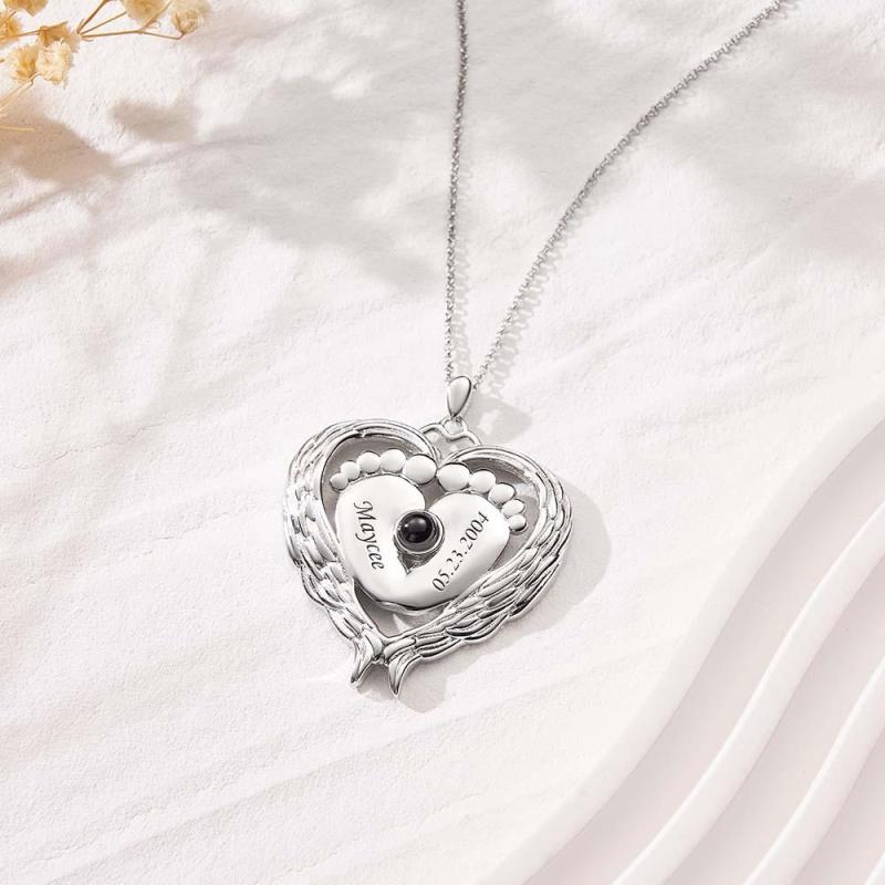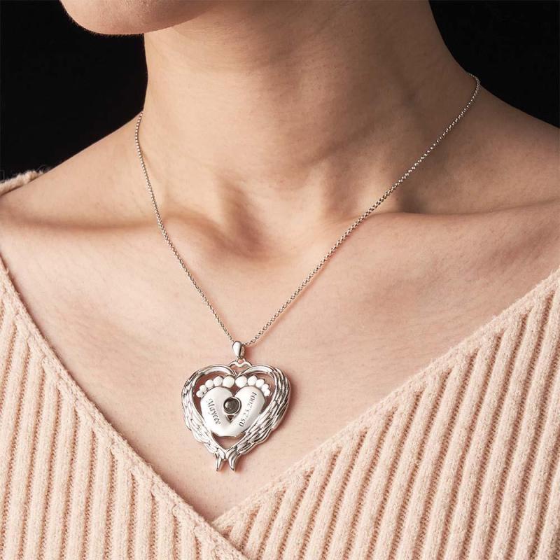 Custom Projection Name Necklace Angel Wings Baby Feet Gift for Mom