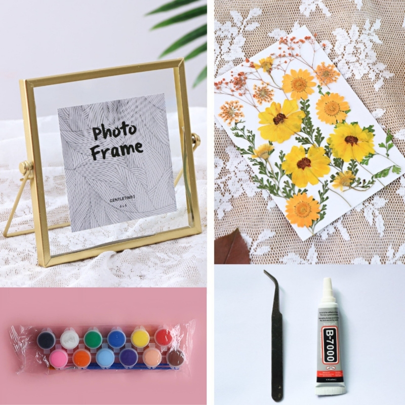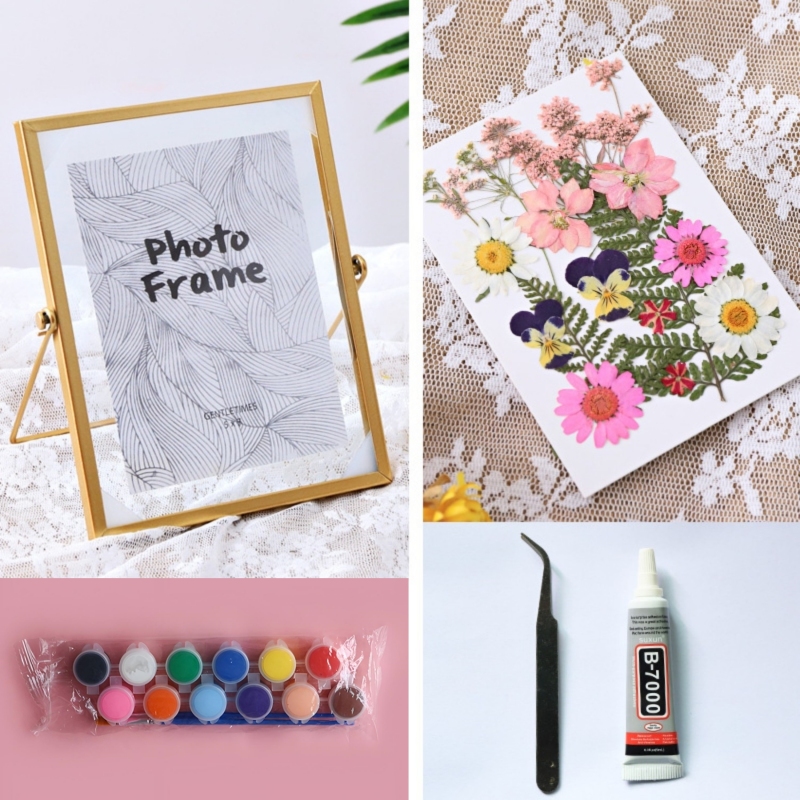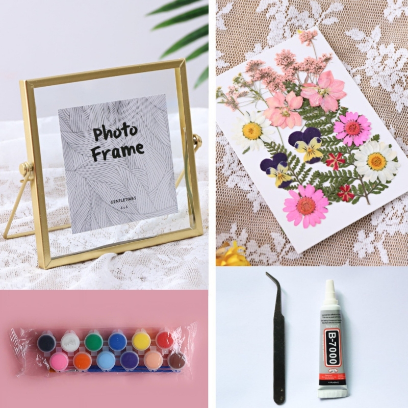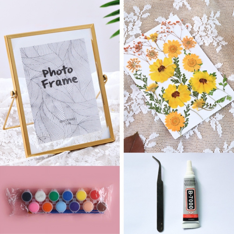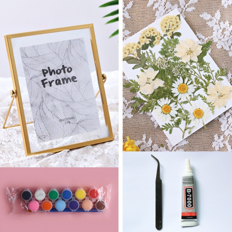 Materials included: frame, dried flowers, tweezers, glue, acrylic paint, two paintbrushes