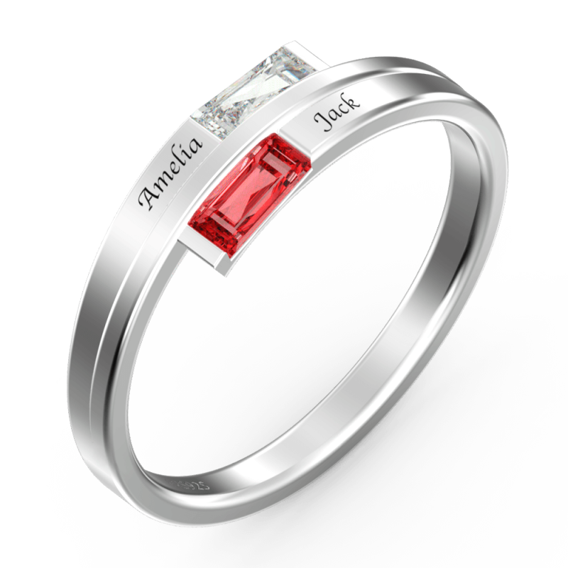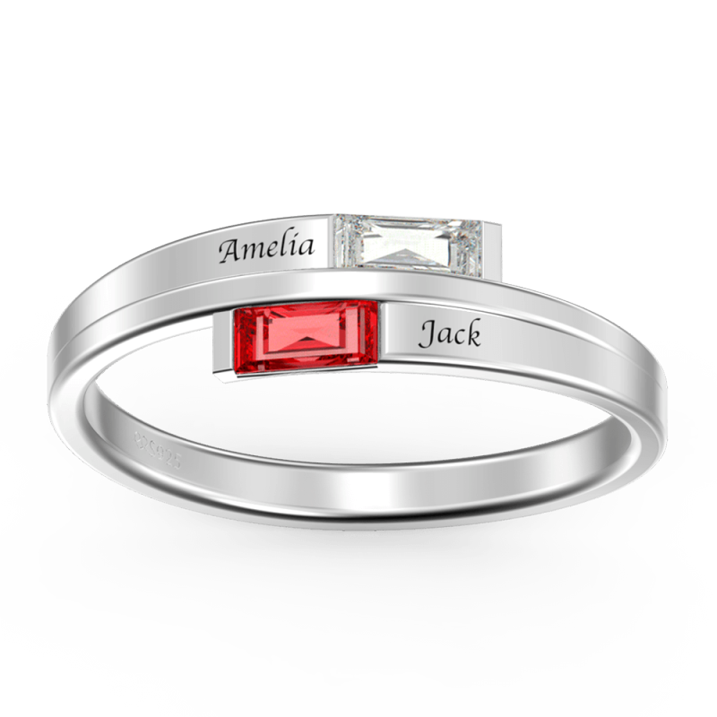 Personalized Birthstone Double Baguette Bypass Promise Ring with Engraving Silver