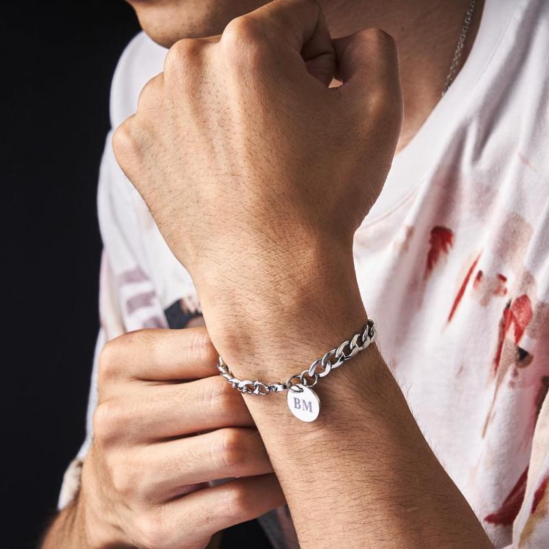 Engraved Initials Thick Cuban Chain Link Bracelet Stainless Steel Bracelet for Men