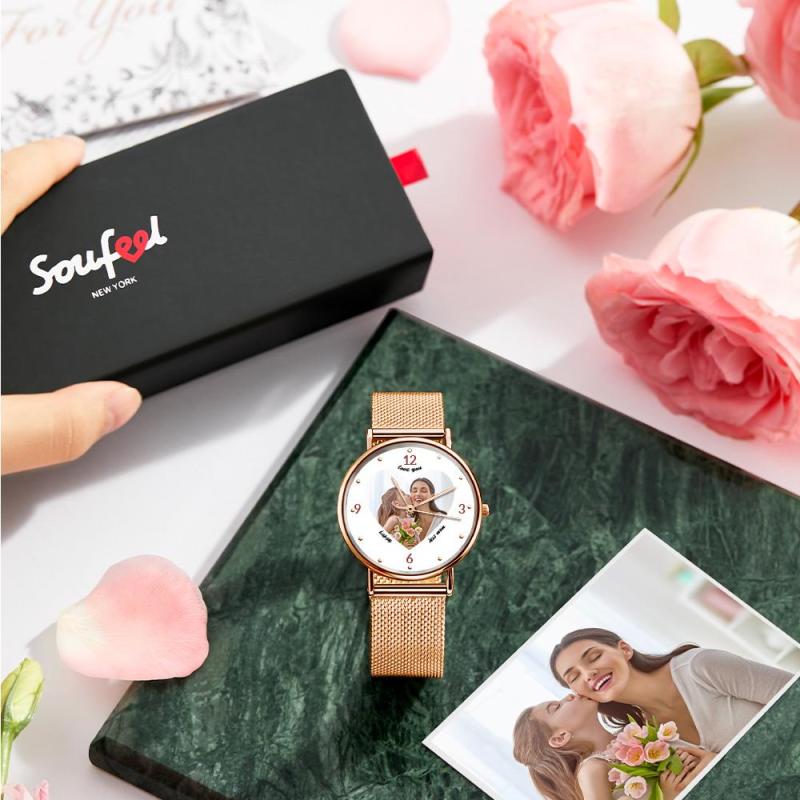 Engraved Rose Gold Alloy Bracelet Photo Watch 36mm Gifts for Mom
