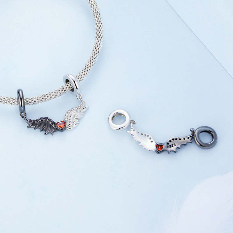 Evil and Angel Wing with Red Heart Dangle Charm Silver