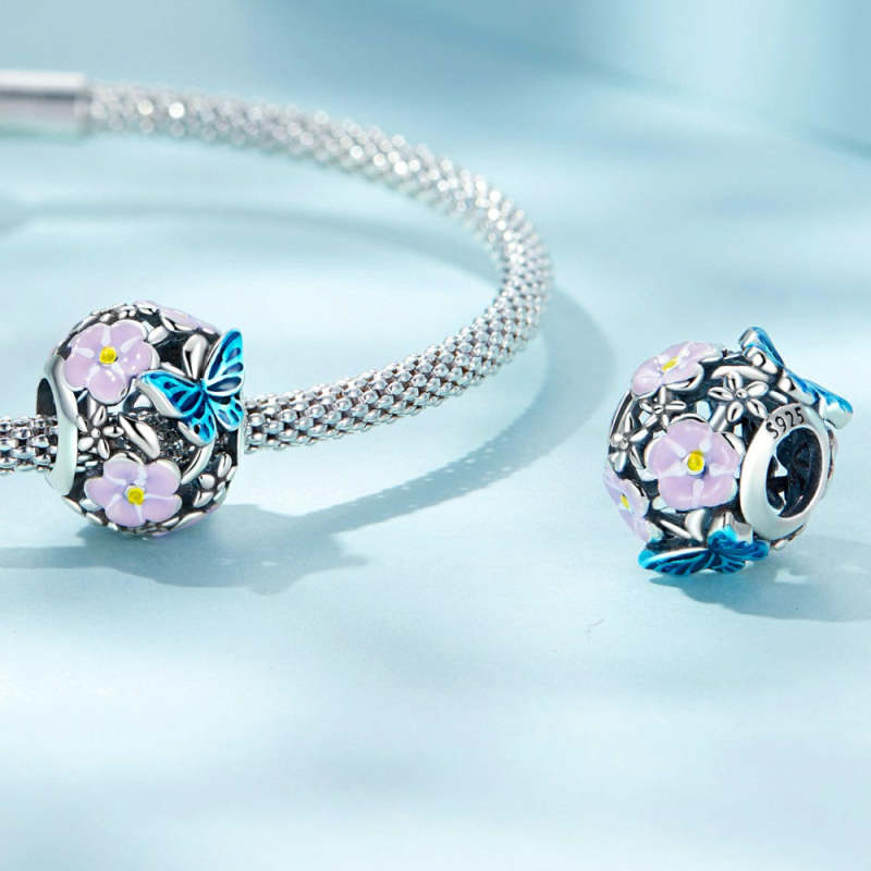 Flower Butterfly Enamel Charm Silver