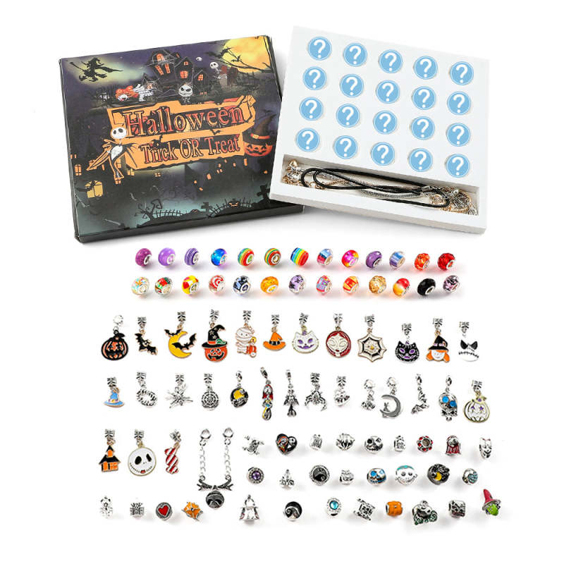 Our Halloween Charms Blind Box comes with 20 randomly selected charms from a collection of 85 unique Halloween beads — plus a gold bracelet, a silver bracelet, and a matching necklace. Mix, match, and create endless spooky-cute looks that are totally you!