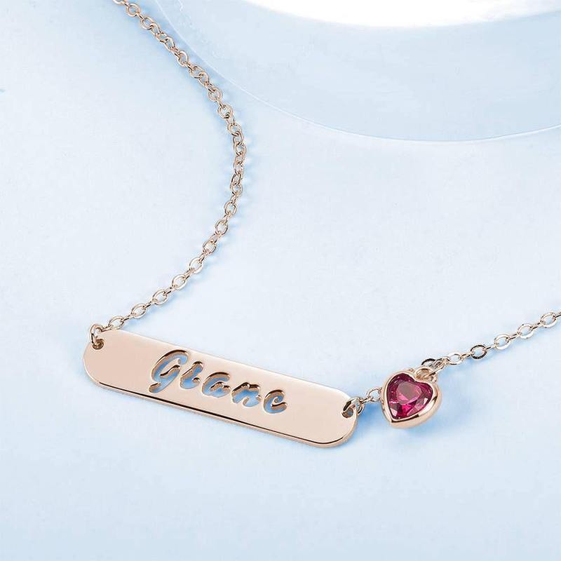 Hollow Carved Bar Name Necklace with Custom Birthstone, Unique Gift Rose Gold Plated