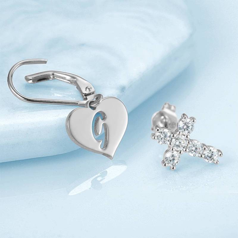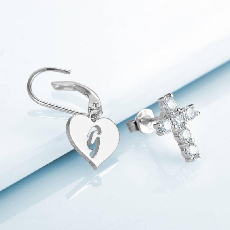 Initial Drop Earrings, Asymmetry Earrings Hollow Letter with Cross Platinum Plated - Silver