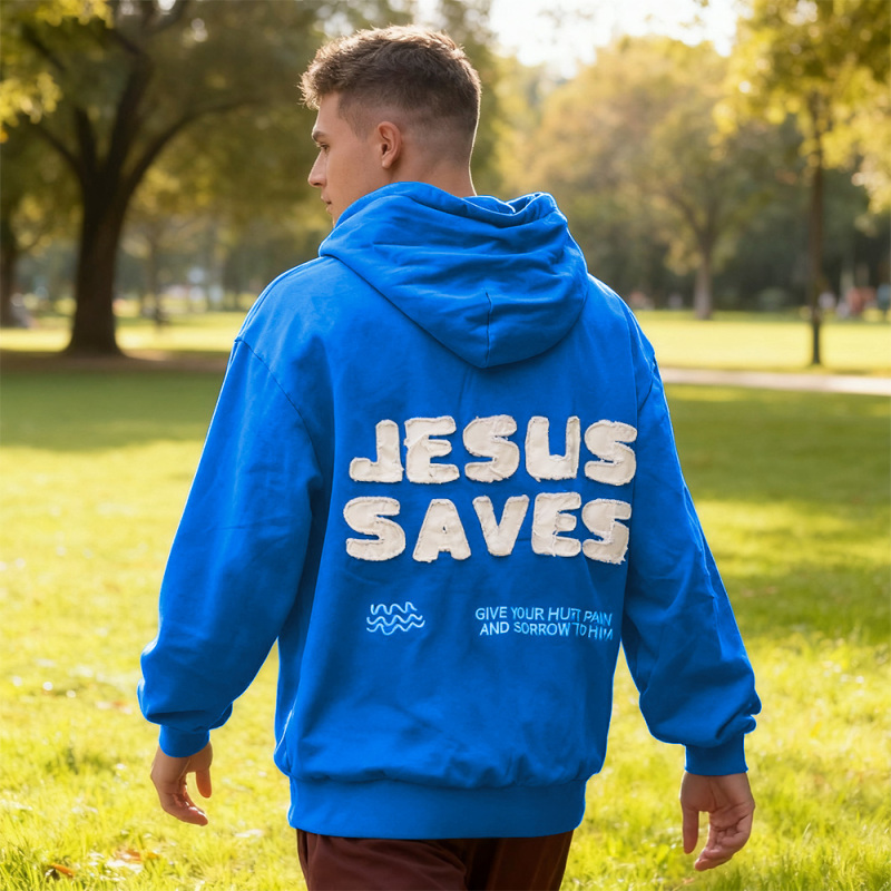 Embrace comfort and faith with our "Jesus Saves" Hoodie. Crafted from soft, high-quality fabric, this hoodie combines everyday style with a powerful message of hope and encouragement. The bold "JESUS SAVES" design on the back serves as a reminder of strength and salvation, while the inspiring words "Give your hurt, pain, and sorrow to Him" bring comfort and positivity wherever you go.