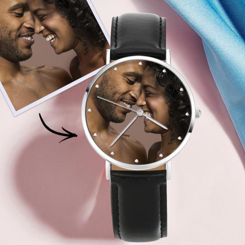 Unisex Engraved Photo Watch Black Leather Strap 40mm Memorial Valentine's Day Gift