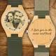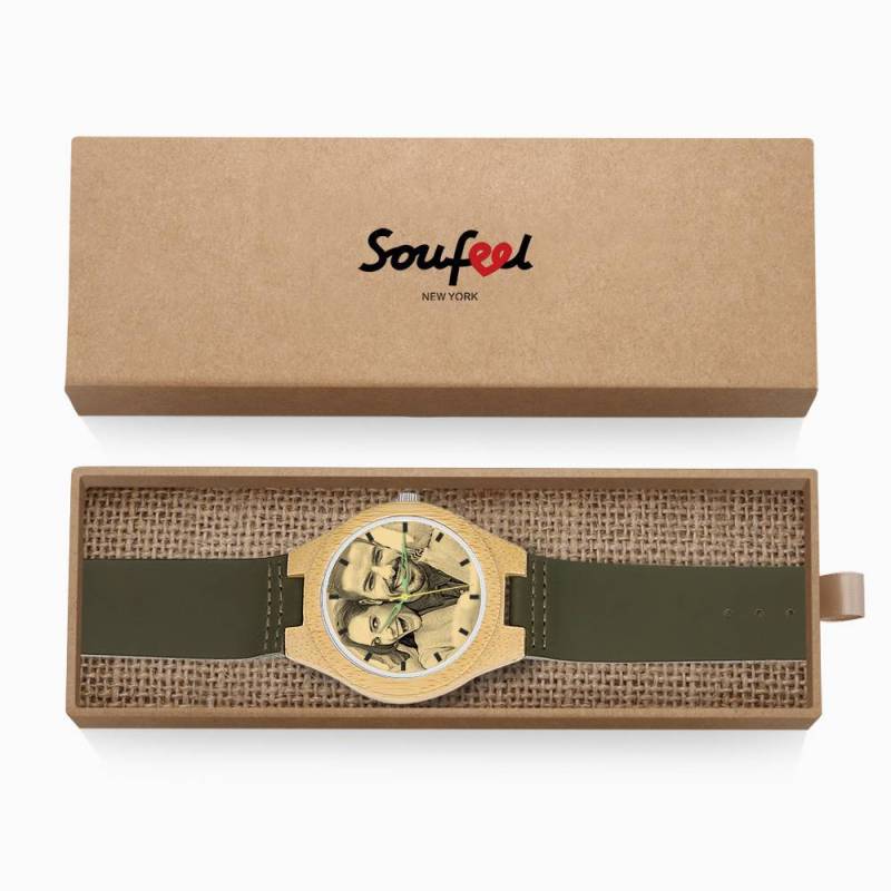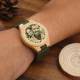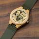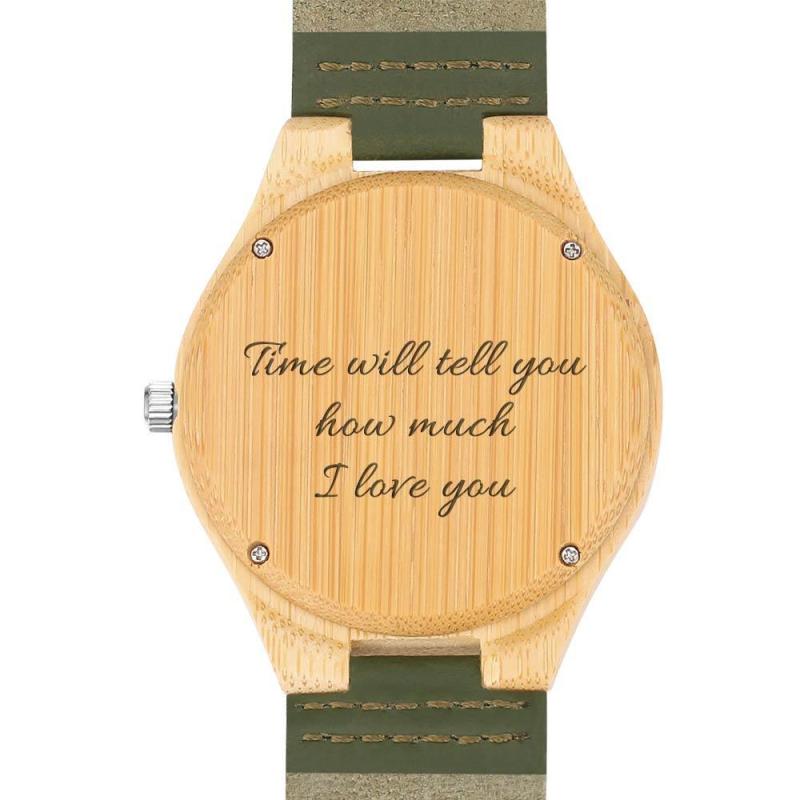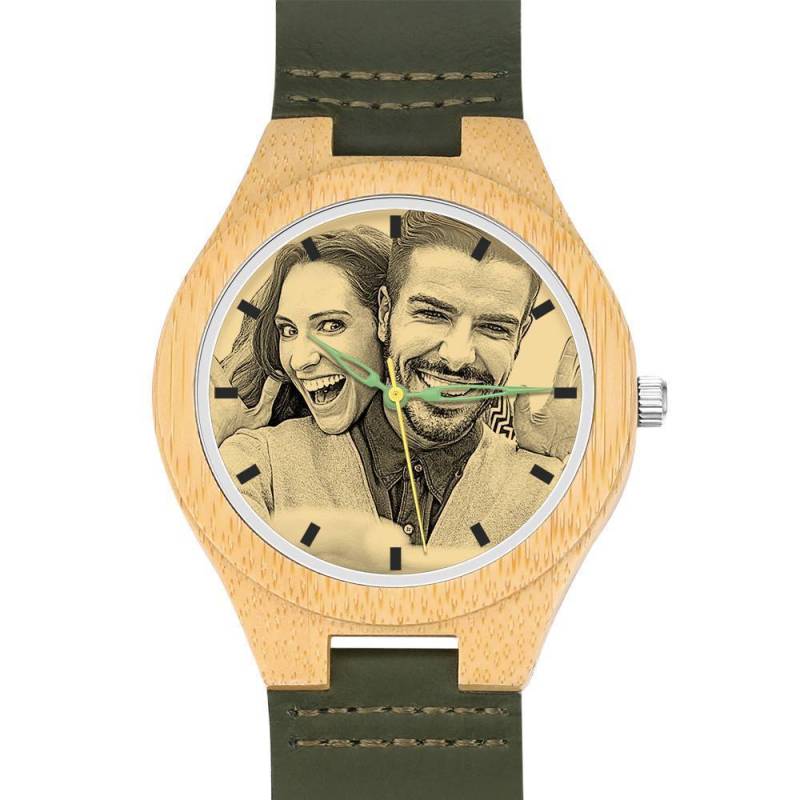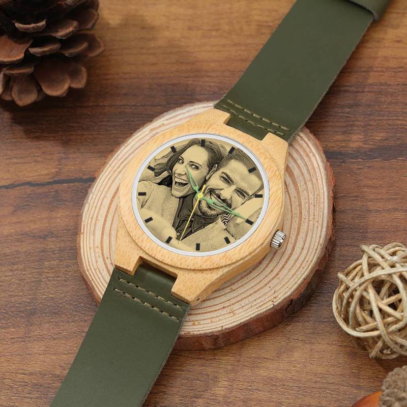 Men's Engraved Bamboo Photo Watch Dark Green Leather Strap 45mm