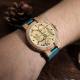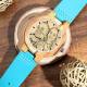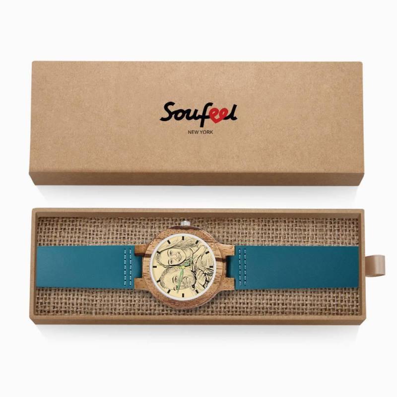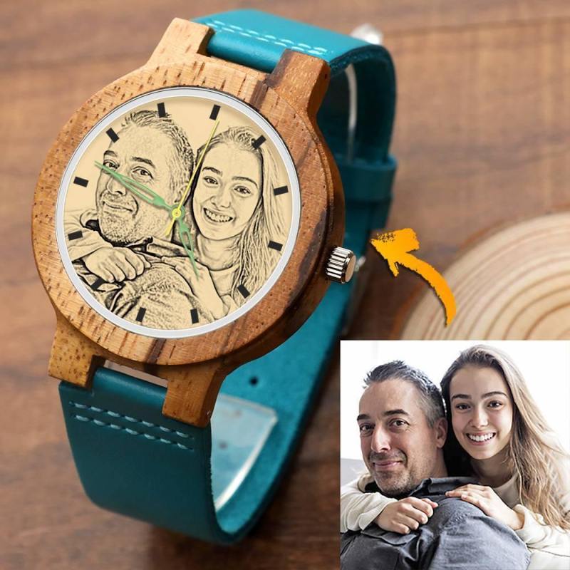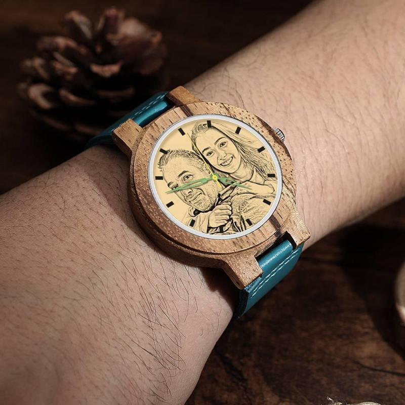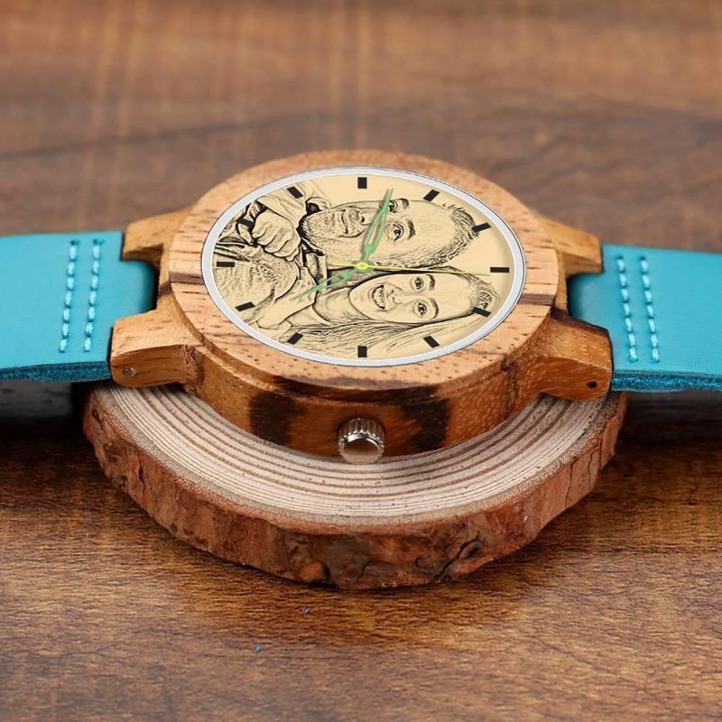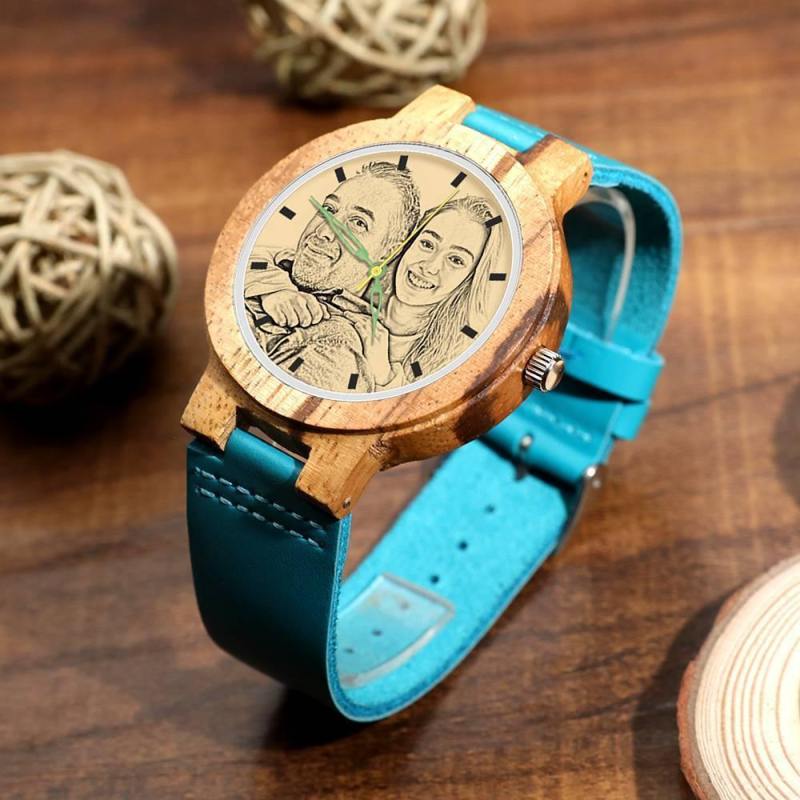 Men's Engraved Wooden Photo Watch Blue Leather Strap - Zebra Wood