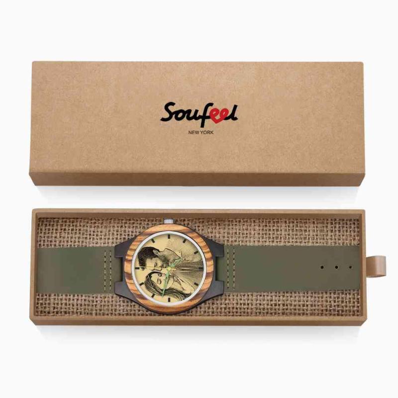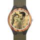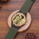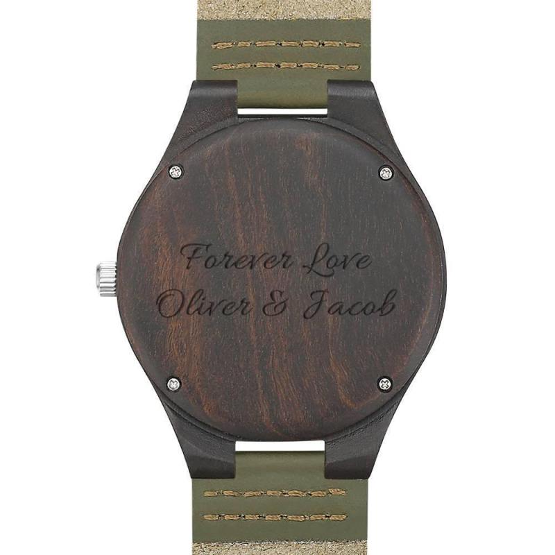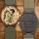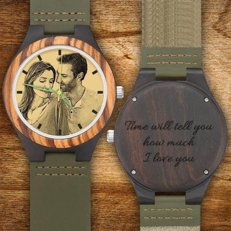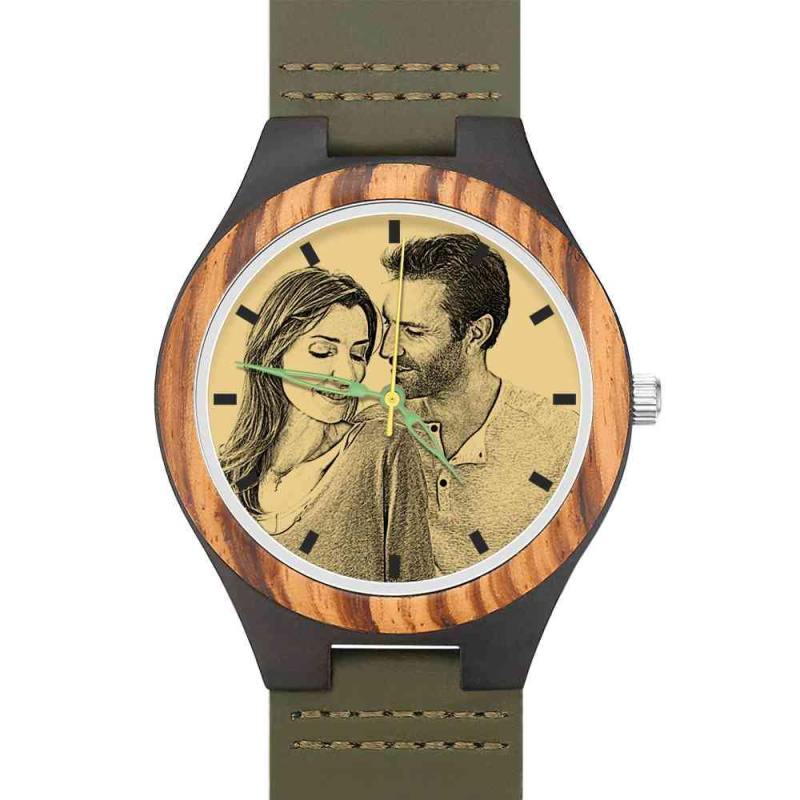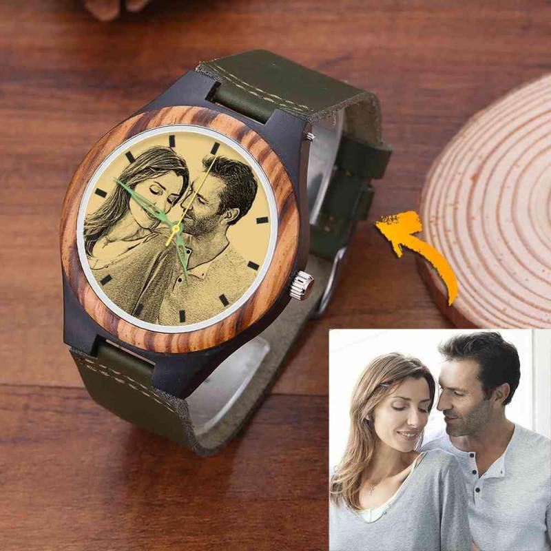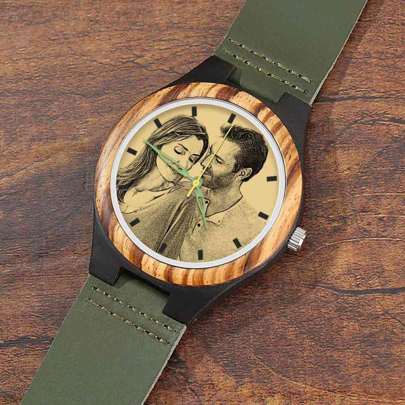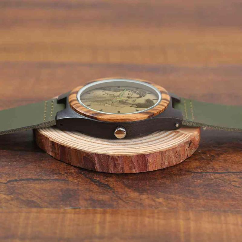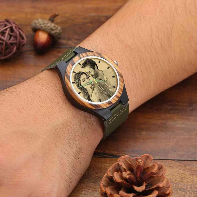 Men's Engraved Wooden Photo Watch Dark Green Leather Strap 45mm