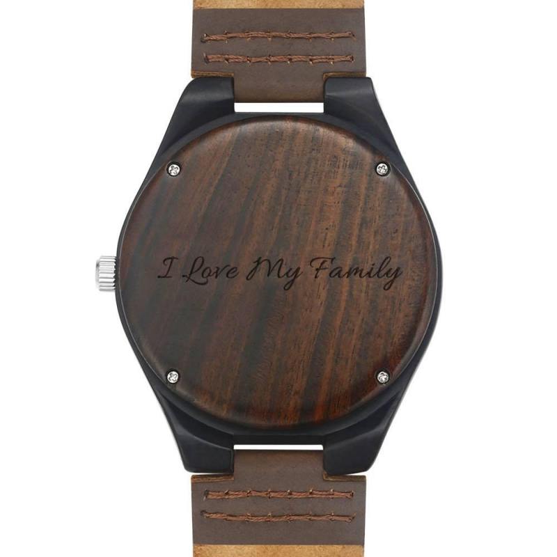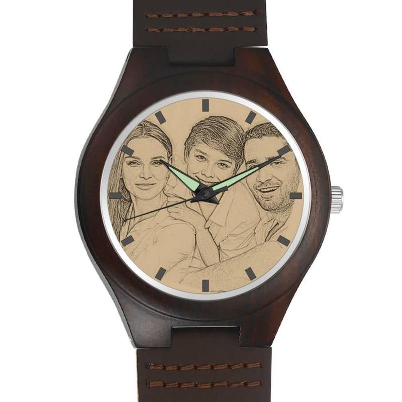 Men's Engraved Wooden Photo Watch Brown Leather Strap 45mm