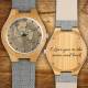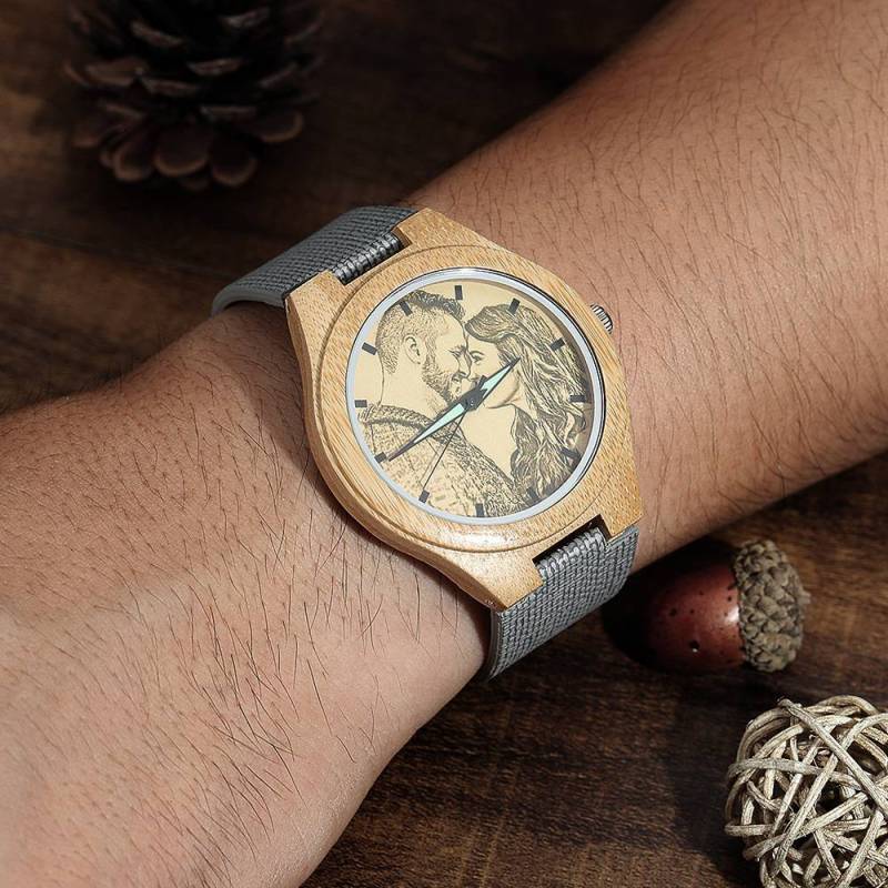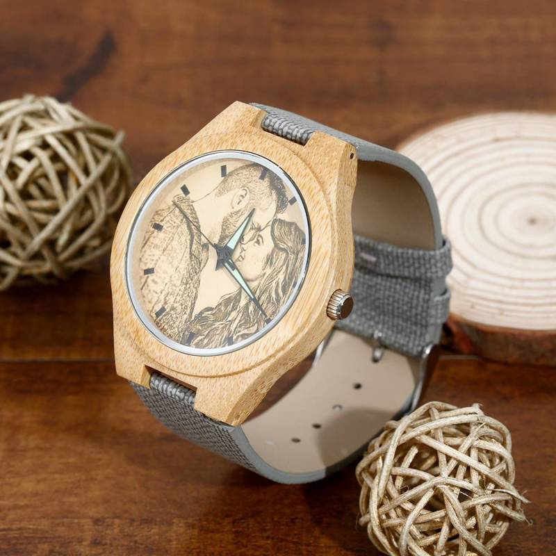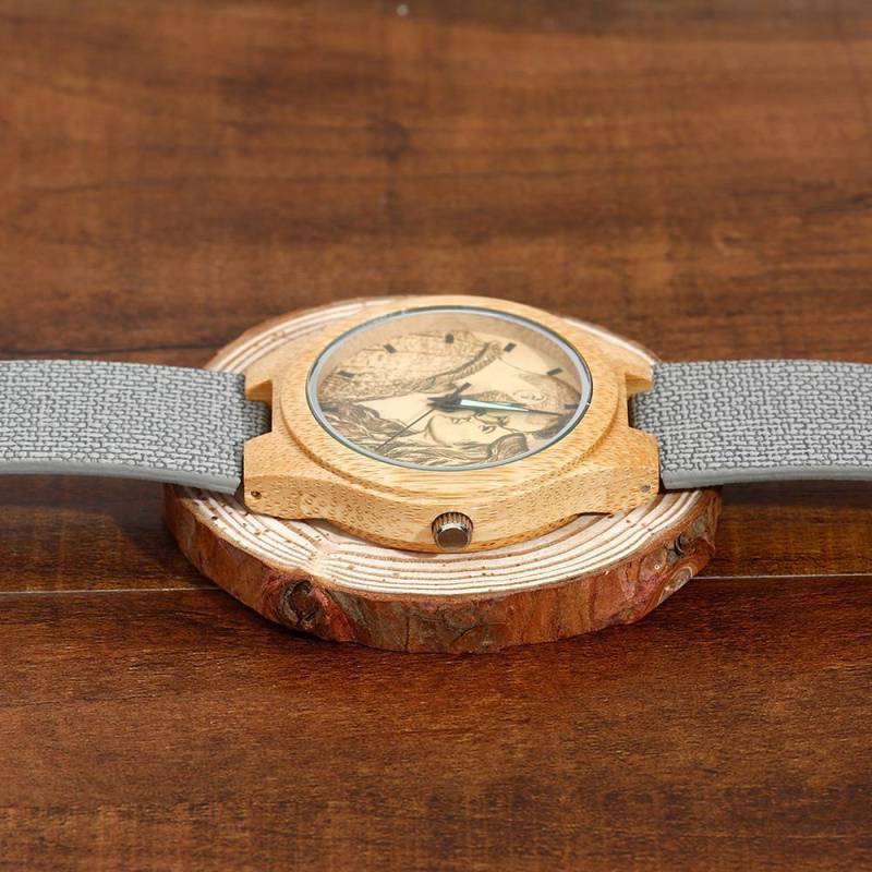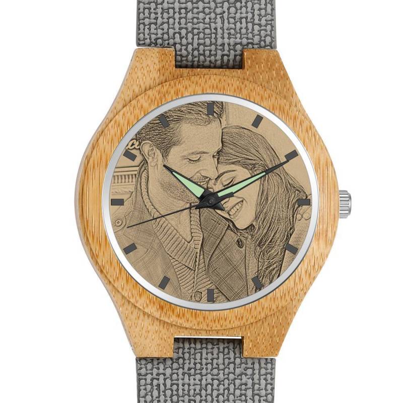 Men's Engraved Bamboo Photo Watch Grey Leather Strap 45mm
