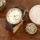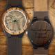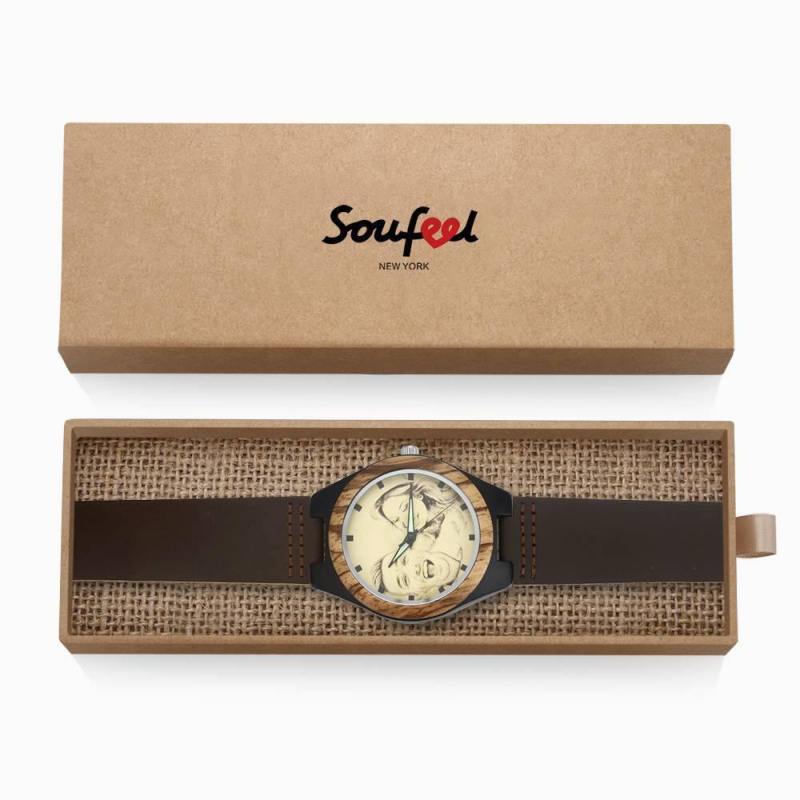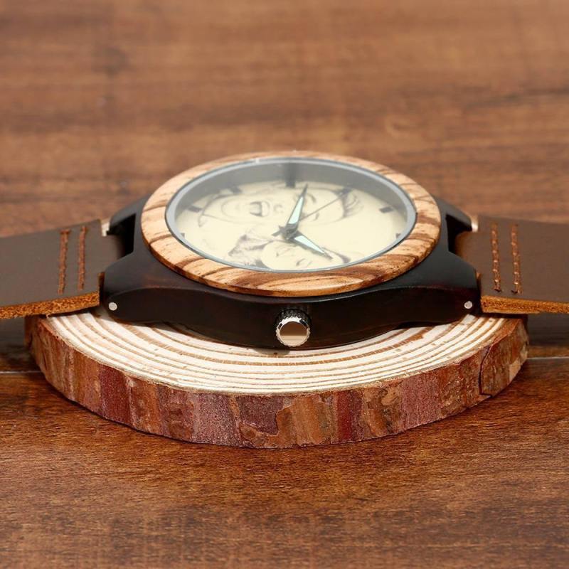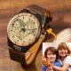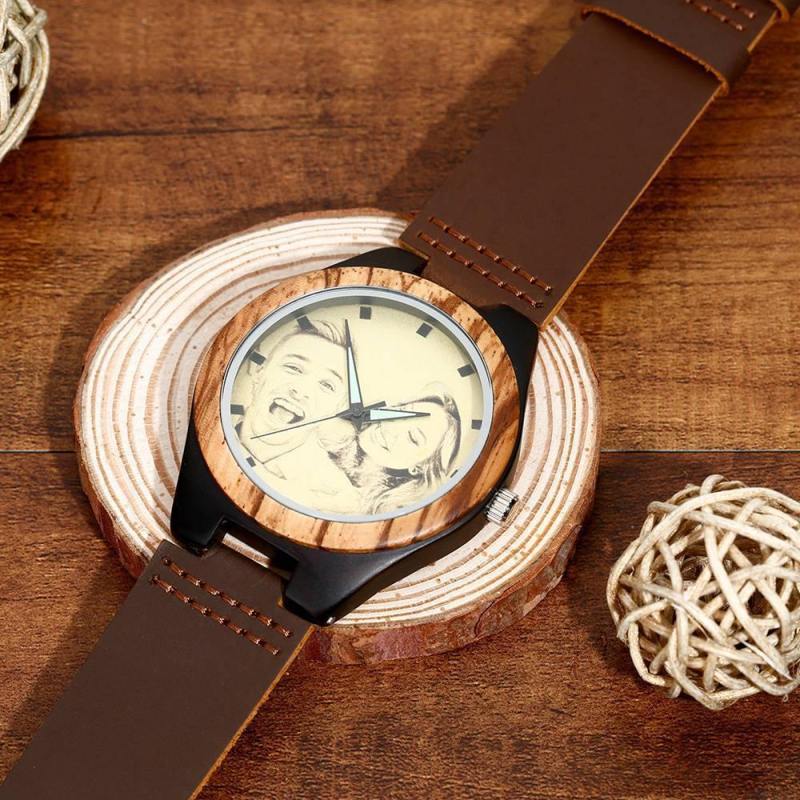 Men's Engraved Wooden Photo Watch Brown Leather Strap 45mm