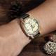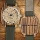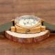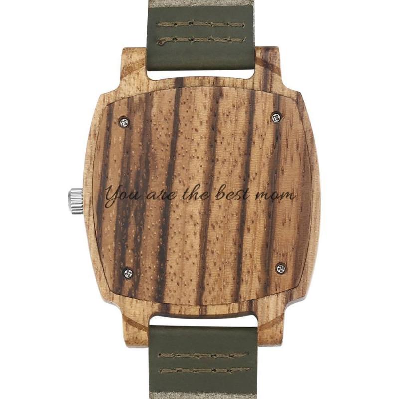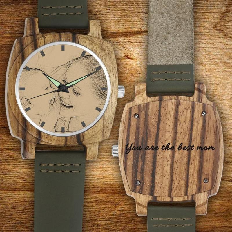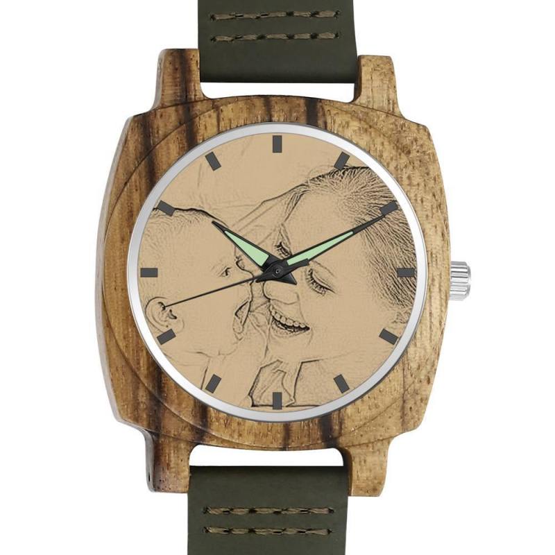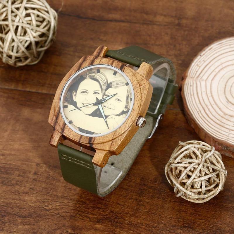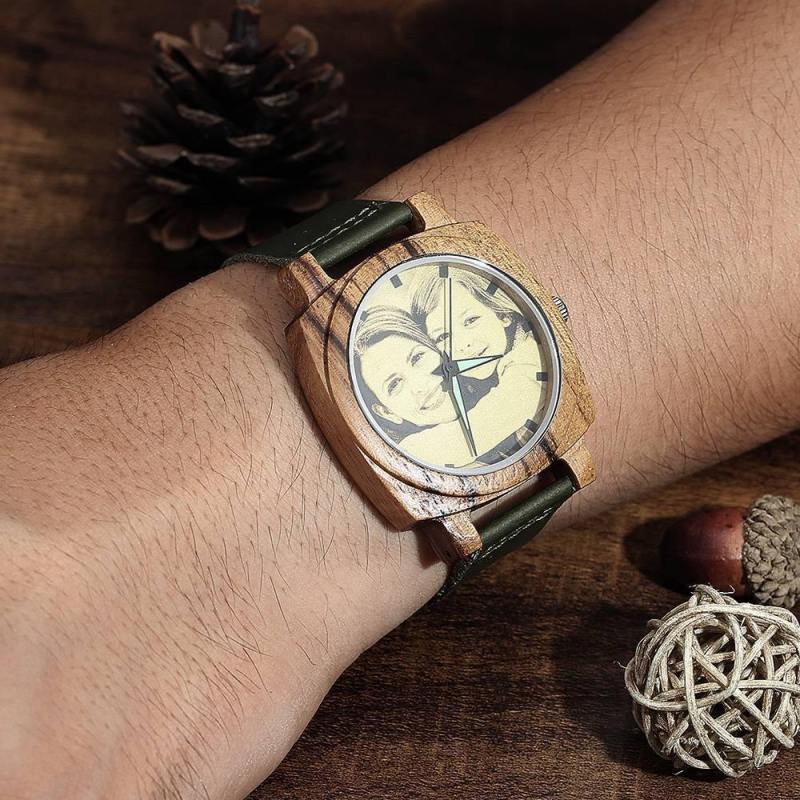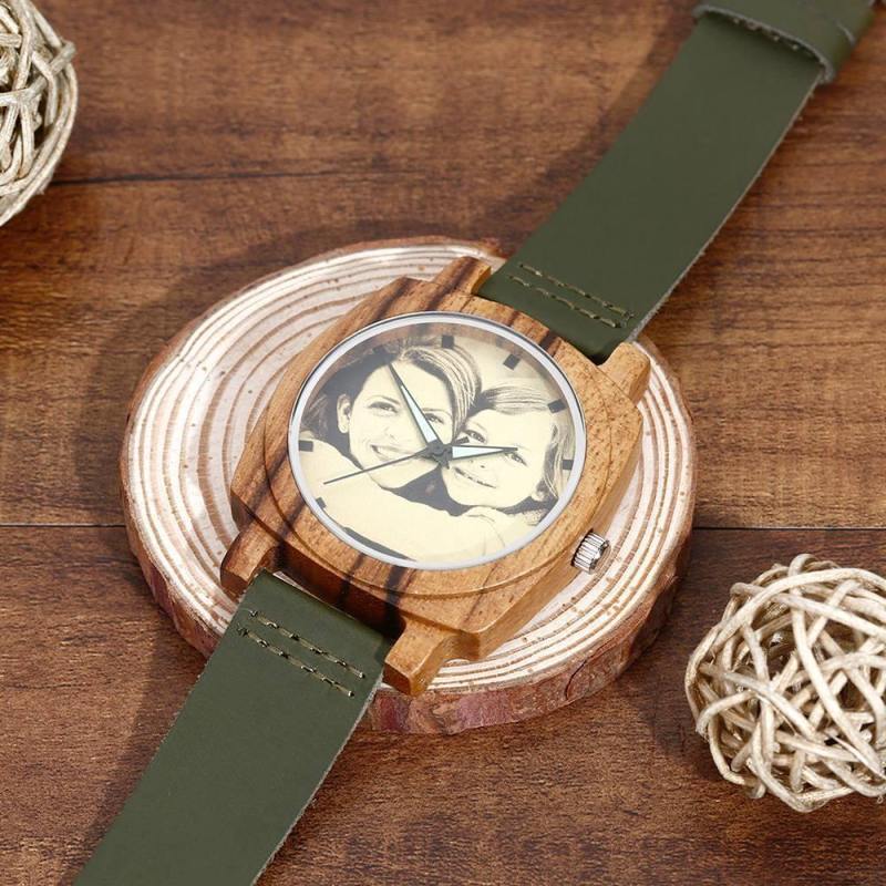 Men's Engraved Bamboo Photo Watch Dark Green Leather Strap 45mm