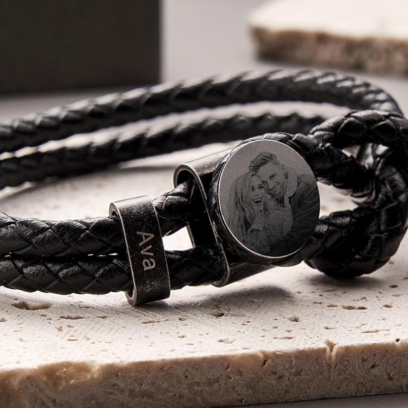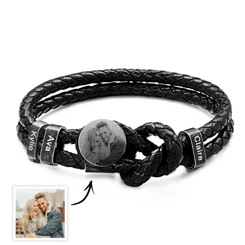 Experience a timeless blend of style and sentimentality with our Mens Retro Leather Photo Bracelet. Crafted with fine leather, this bracelet elegantly showcases a cherished family photo, paired with 2-5 custom engraved names. The perfect Fathers Day gift for dad, this bracelet effortlessly captures the essence of love and connection. Choose from 2, 3, 4, or 5 names to create a truly personalized and meaningful present. Surprise your loved one with a unique and everlasting memento that they will cherish forever.