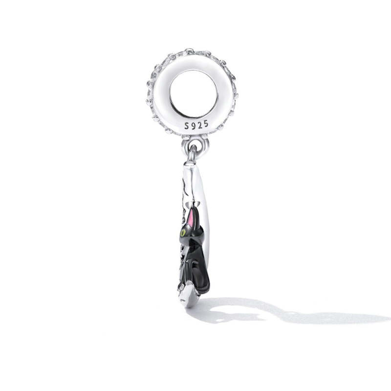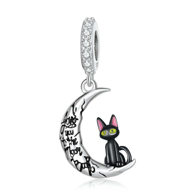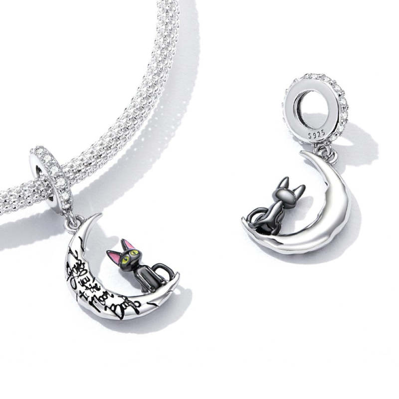 Moon and Black Cat Dangle Charm Silver