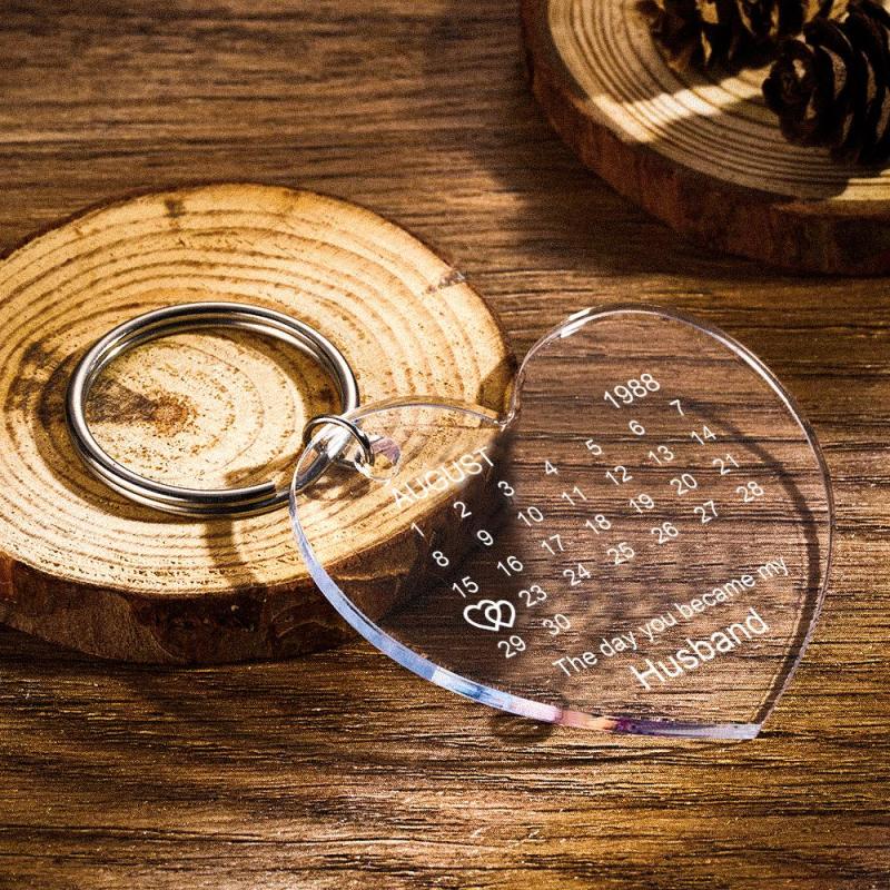 Personalised calendar keyrings.Engraved with The Day You Became My Husband or anything.The date replaced with a double heart.This unique acrylic key chain is the best gift for him/her on the anniversary. Calendar keychain for self-selected date, you can engrave your relationship with him on the acrylic plaque, you can generate a unique date.