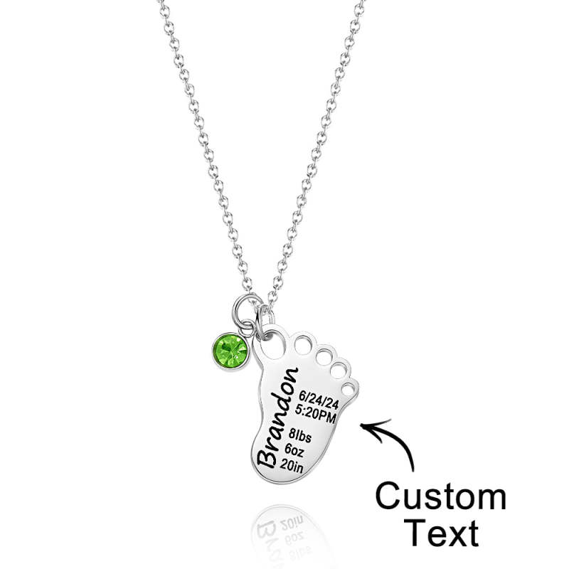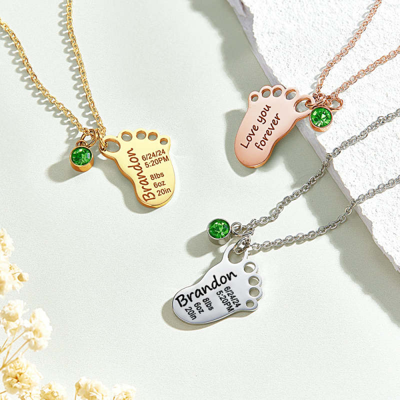 Celebrate the joy of motherhood with our Personalized Baby Foot Necklace. This charming pendant necklace features a unique birthstone and can be customized with your baby's name. A perfect baby shower or birthday gift for new moms, adding a personal touch to any outfit.