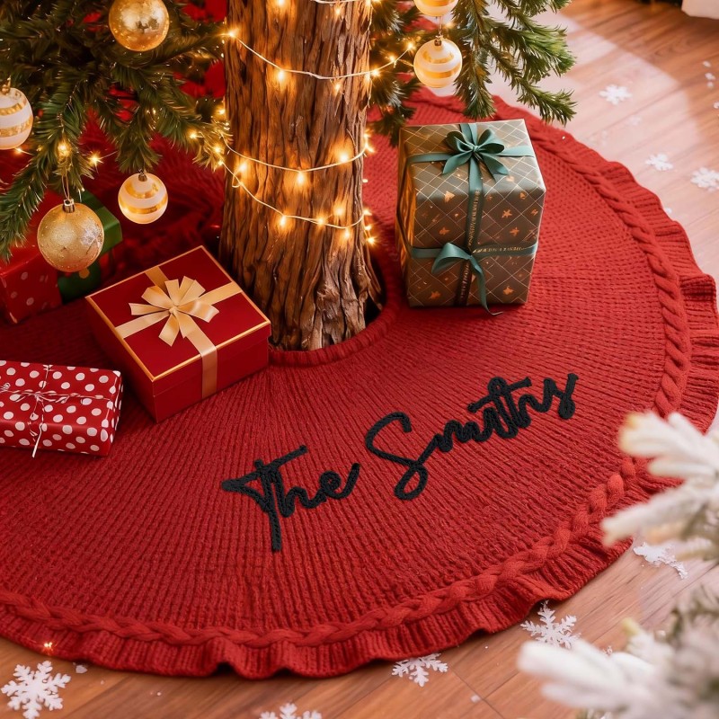 Celebrate the season with our Custom Name Christmas Tree Skirt. This cozy, knitted tree skirt is designed to wrap your Christmas tree in warmth and personal charm. Made from soft, yarn-knit fabric, it doubles as a snug blanket for chilly winter evenings and a festive centerpiece for family gatherings. Personalize the skirt with a name in your choice of color, and choose from classic red or white to perfectly match your holiday decor. Available in three diameter options to fit any tree: 62 cm, 92 cm, and 122 cm. Make your home feel truly special with a one-of-a-kind Christmas keepsake gift.