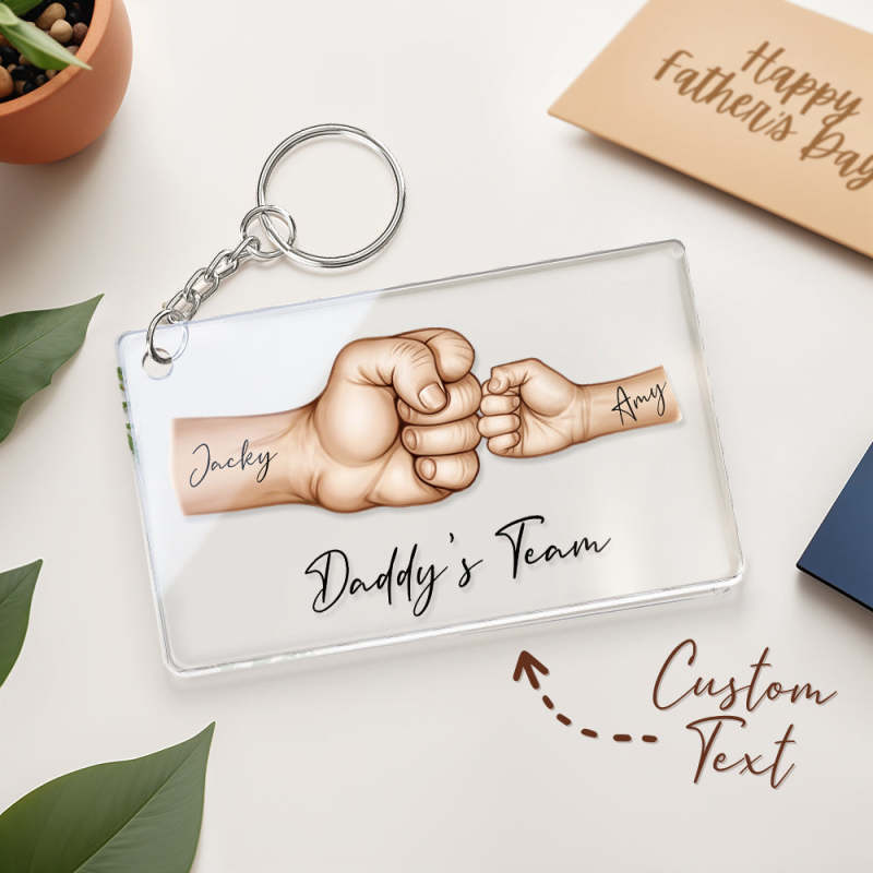 Celebrate Dad with our "Daddy's Team Fist Bump" Personalized Acrylic Keychain. This custom keyring features fists and paws, along with names, making it a unique and heartfelt gift for Father's Day, birthdays, and Christmas. Perfect for the dad who cherishes his team, this keychain symbolizes the strong bond shared with his loved ones, including the family pet. Give Dad a meaningful keepsake that he can carry with him everywhere, reminding him of his special team.