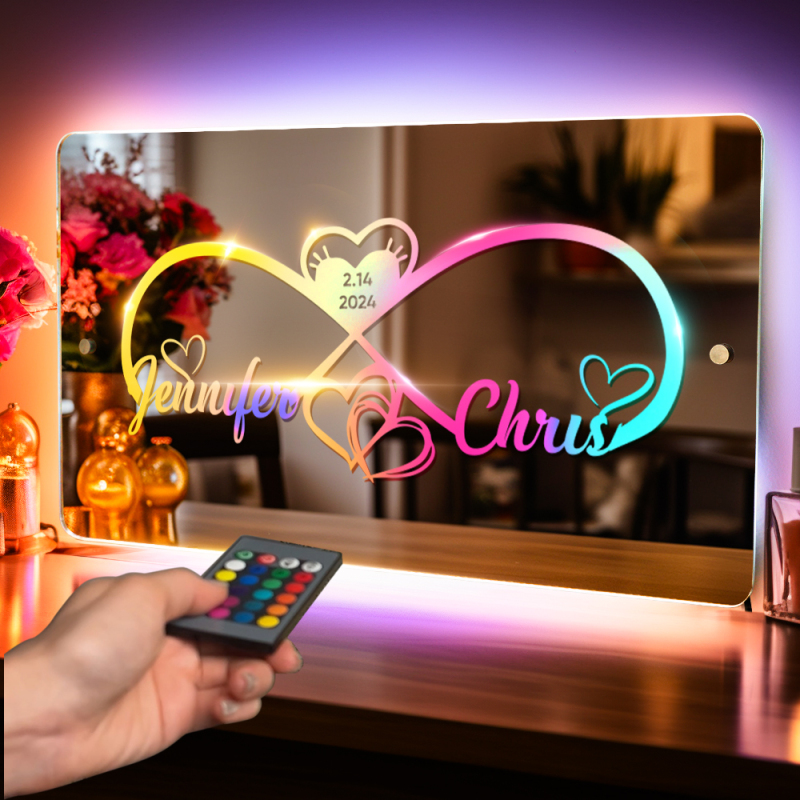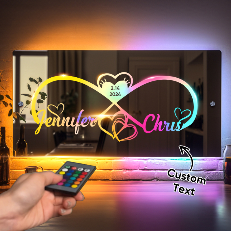 What’s in the box:Personalised name mirror with LED lighting, made from lightweight, shatterproof acrylic. Includes remote control and wall mounting stand-offs.