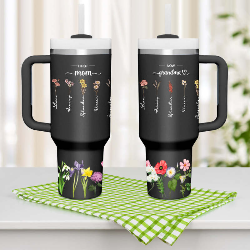 Introducing the personalized flower tumbler with straw for mom and grandma, A stylish and meaningful sipper for the special women in your life. This personalized tumbler allows you to customize beautiful flowers with names, creating a beautiful and practical tribute for your mom and grandma.
