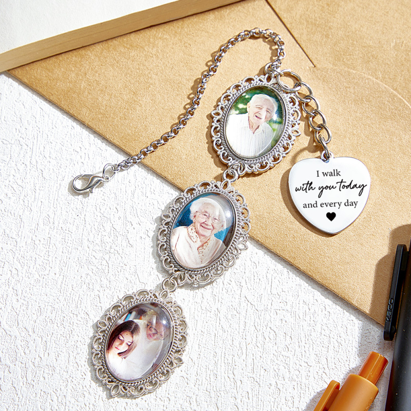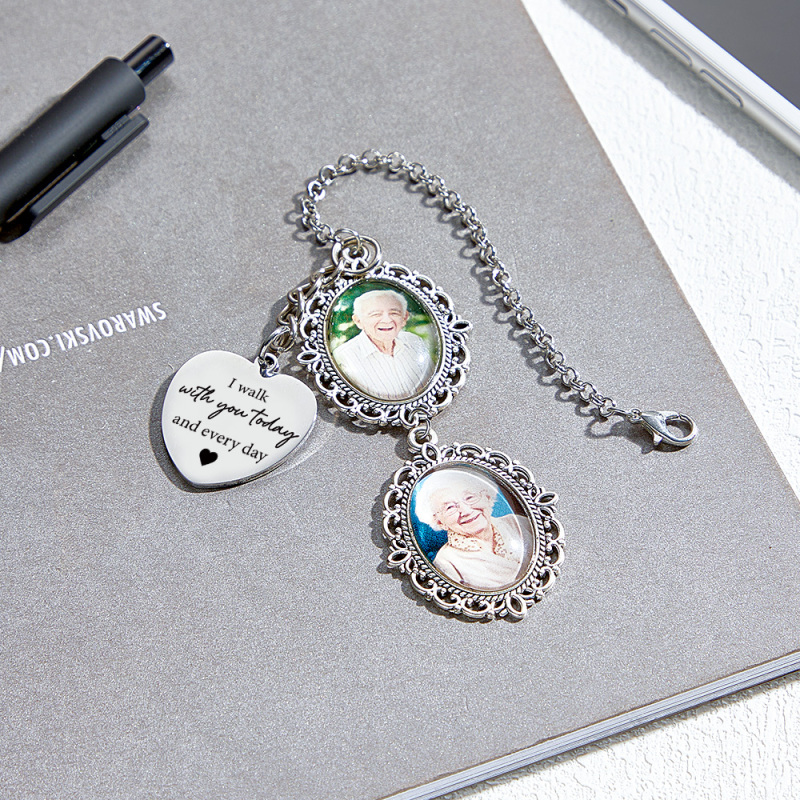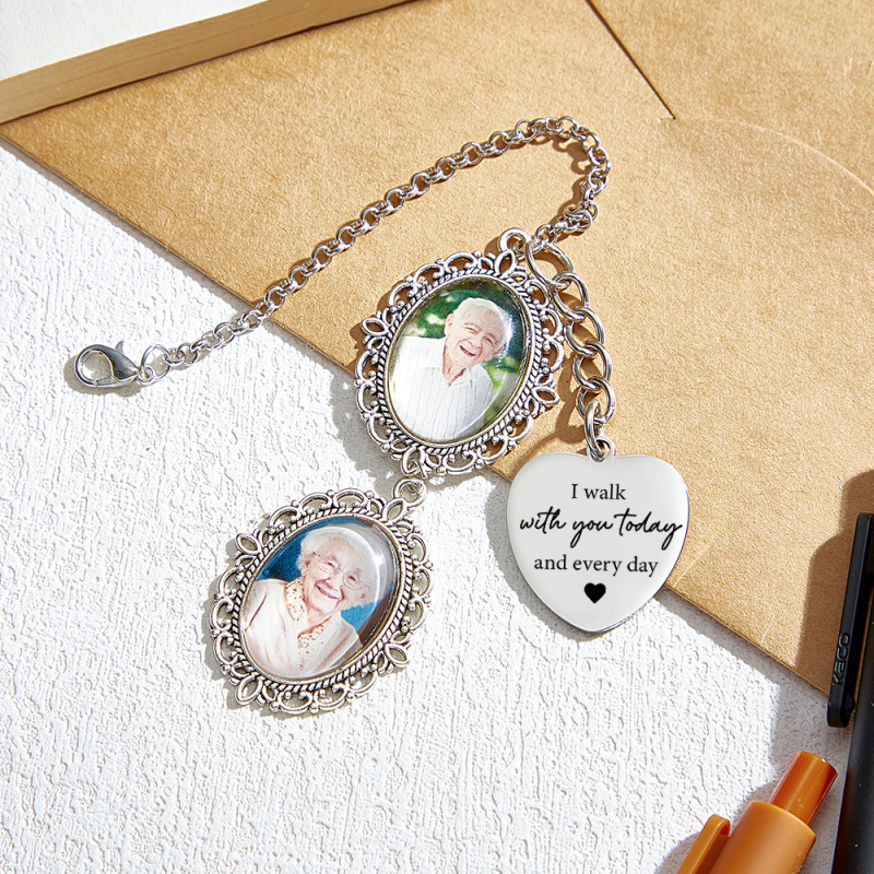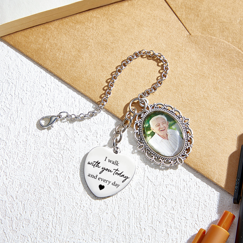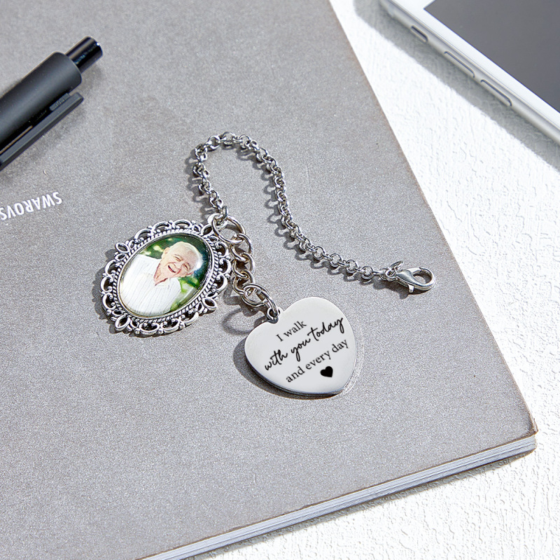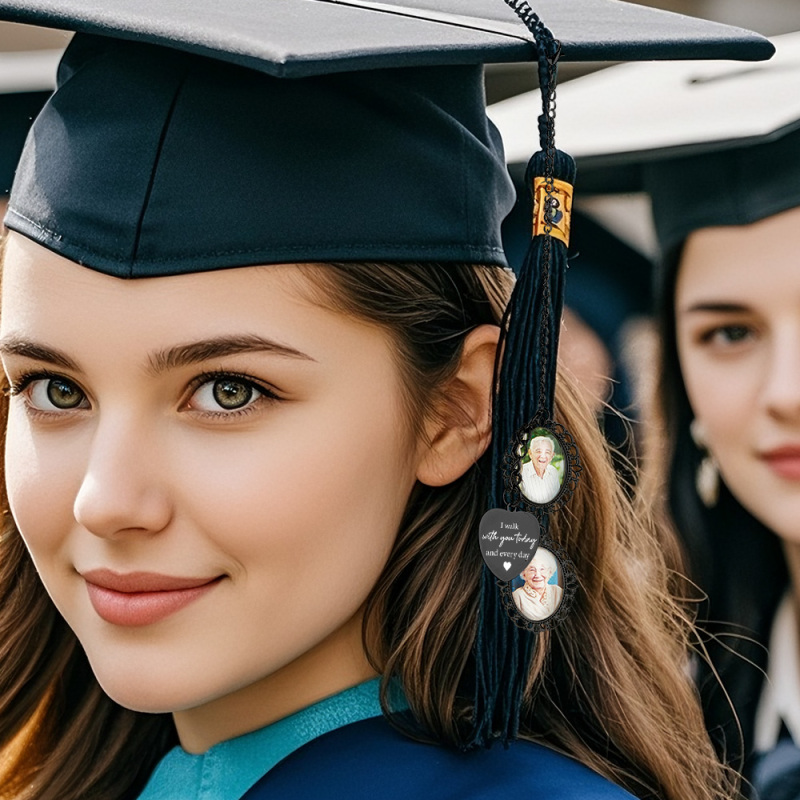 Celebrate the memory of a loved one on your special day with this Graduation Memorial Photo Charm—a heartfelt keepsake to accompany you as you step onto the stage. This personalized tassel charm showcases a customized photo set in an elegant vintage-inspired design, complemented by a heart-shaped charm engraved with "I walk with you today and every day."