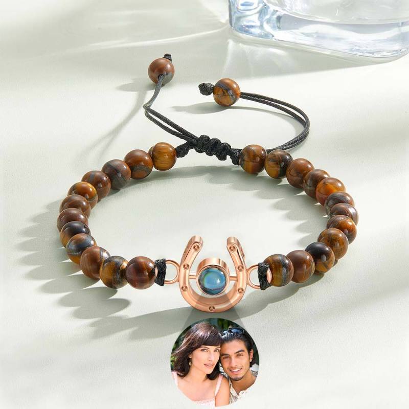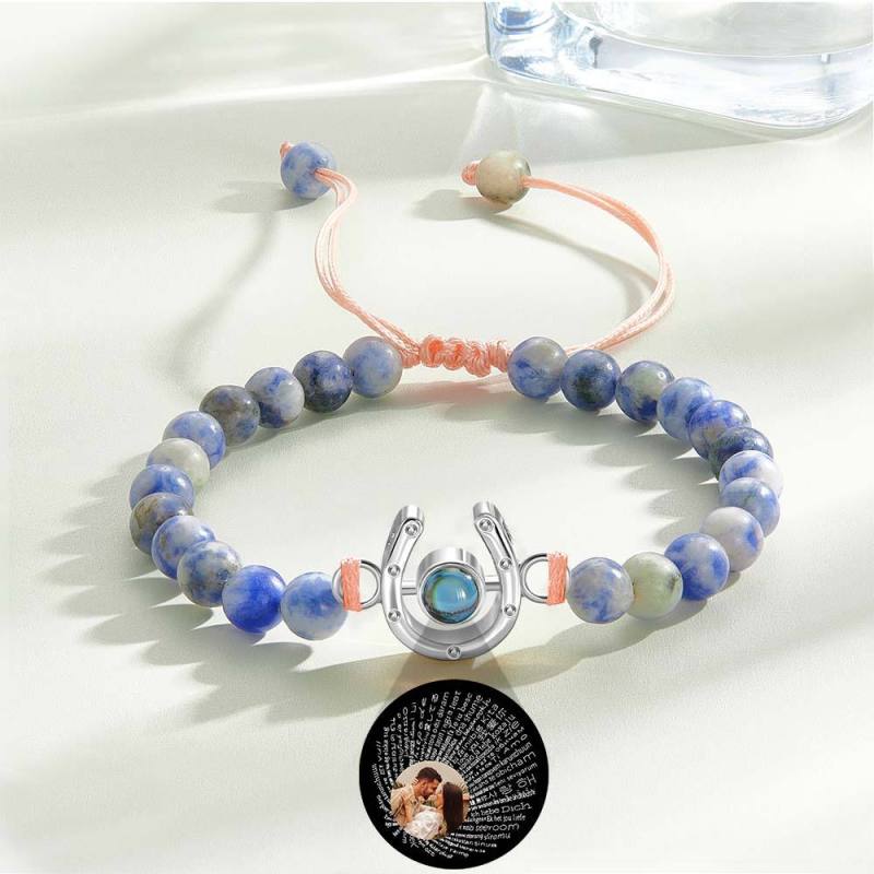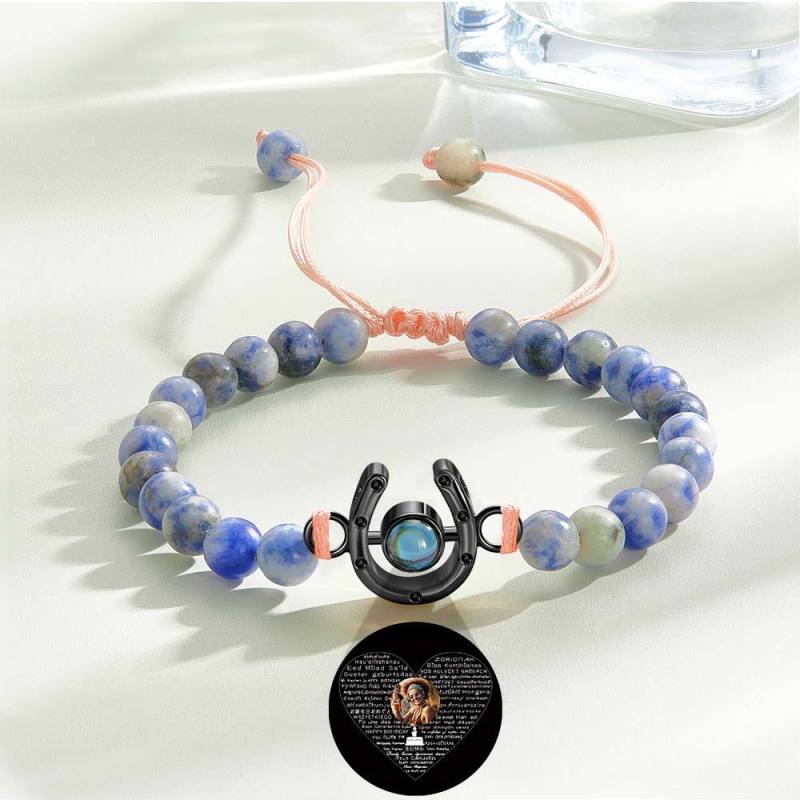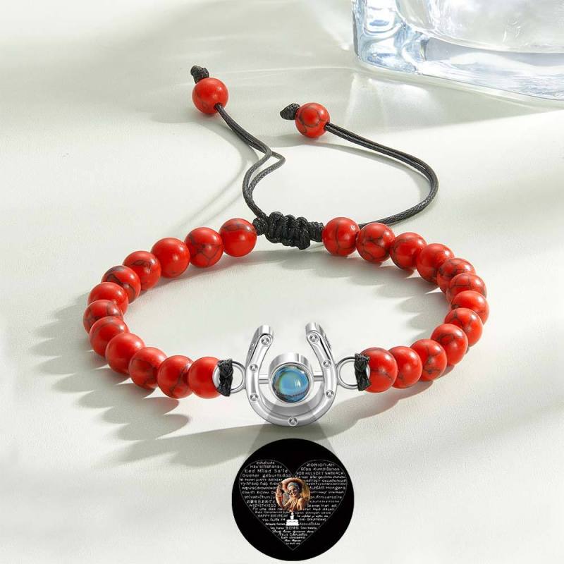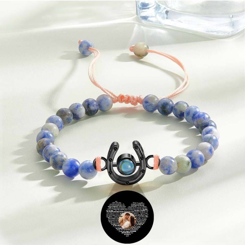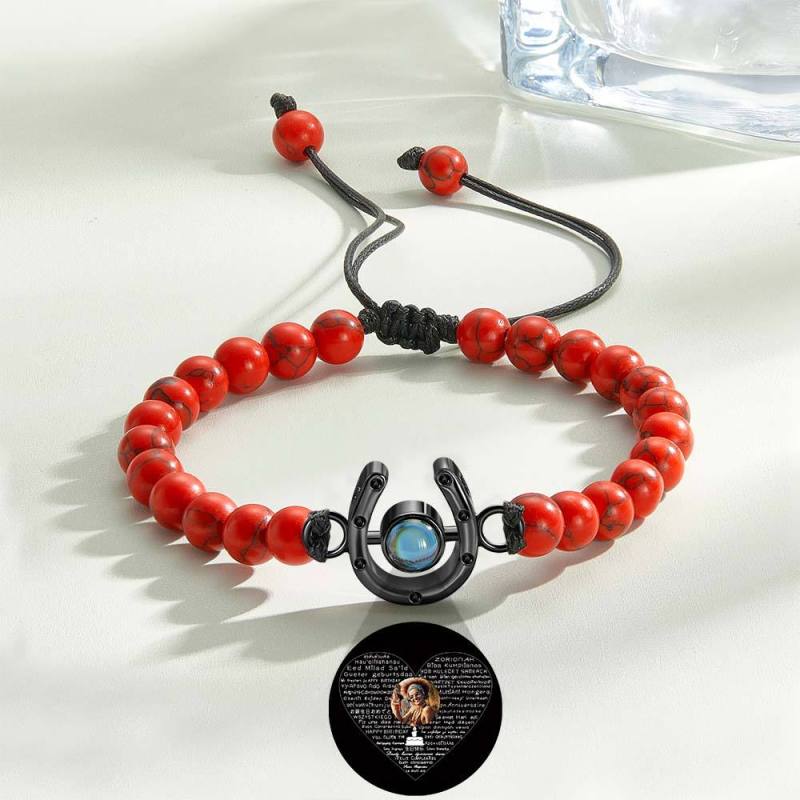 This personalized bracelet is the perfect gift for any horse lover. Featuring a horseshoe charm and photo projection beads, it is a unique and meaningful piece. Show your love for horses with this custom bracelet that can be tailored to your specific style.