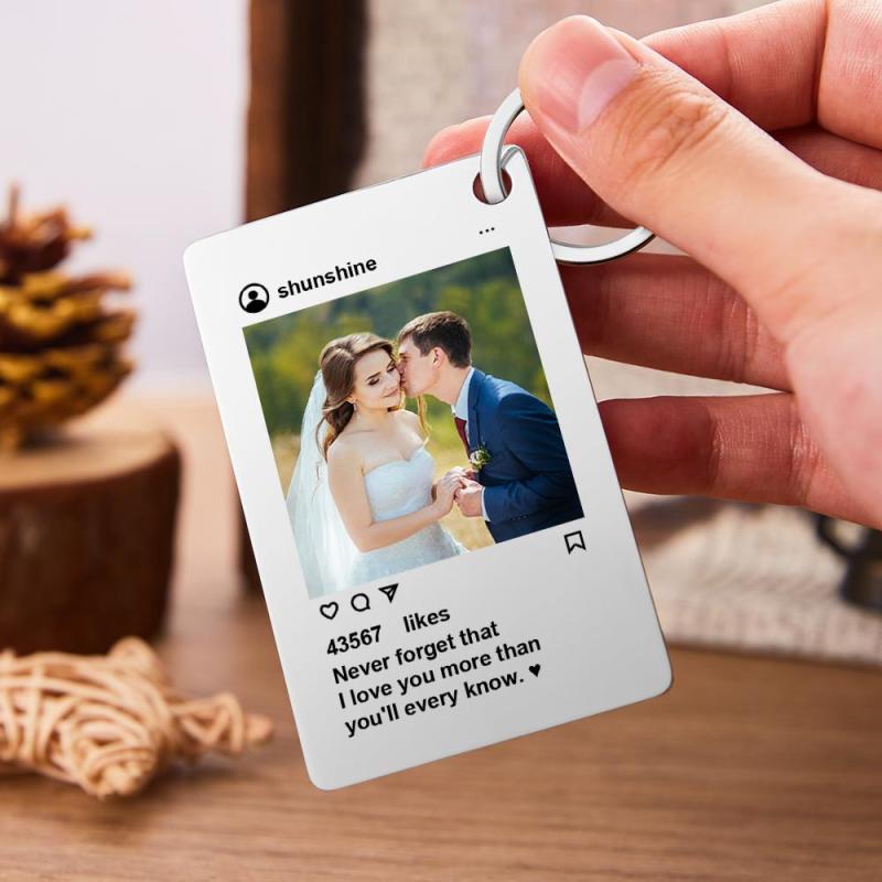 This keychain is made of high-quality metal material and combined with popular design elements on Instagram, making it fashionable yet elegant. You can choose a beautiful photo of you and your partner, and we'll carefully print it and embed it into the keychain, ensuring the image is clear and durable. At the same time, you can also customize the text on the keychain, whether it is your name, anniversary date, or a short love vow, it can be customized according to your personal preferences.