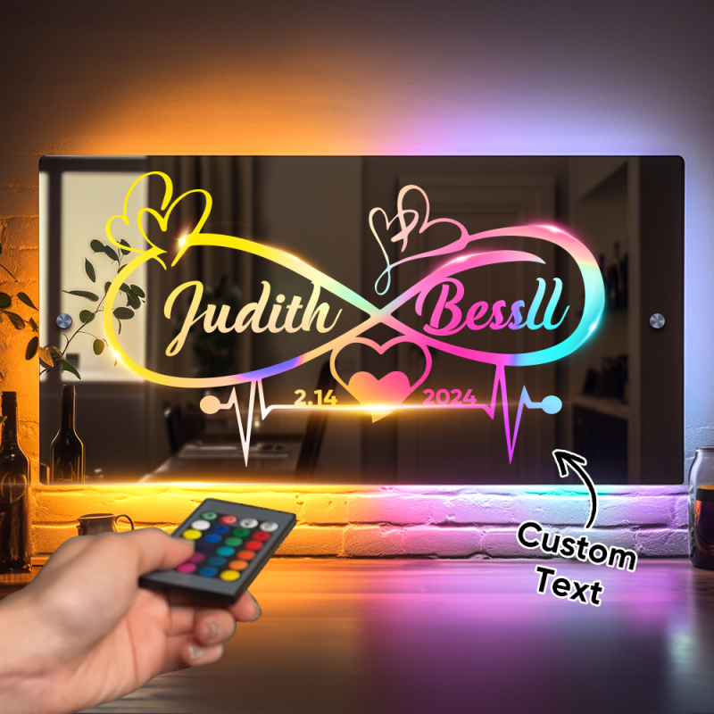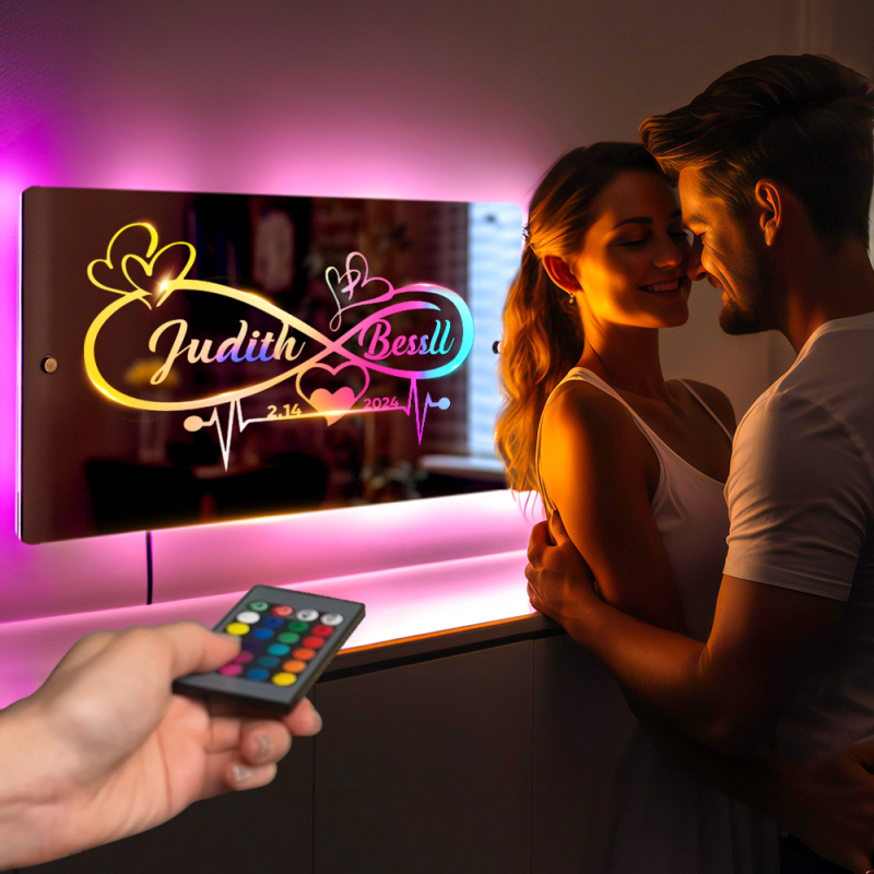 What’s in the box:Personalised name mirror with LED lighting, made from lightweight, shatterproof acrylic. Includes remote control and wall mounting stand-offs.
