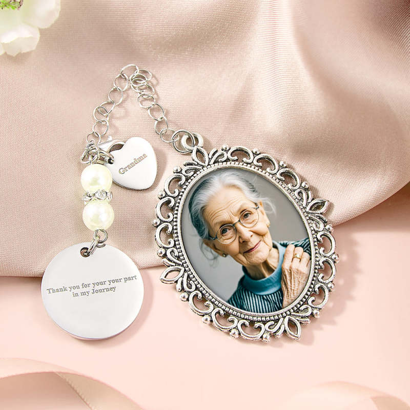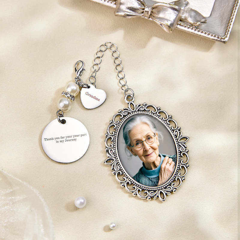 Enhance any bouquet with our Personalized Photo Bouquet Charm, including a heart pendant and room for a photo. This charm serves as a touching memorial wedding gift for the bride, customizable with a meaningful photo. The heartfelt memories will be treasured for eternity.