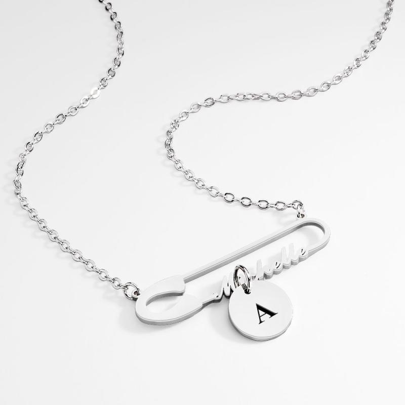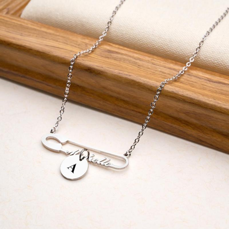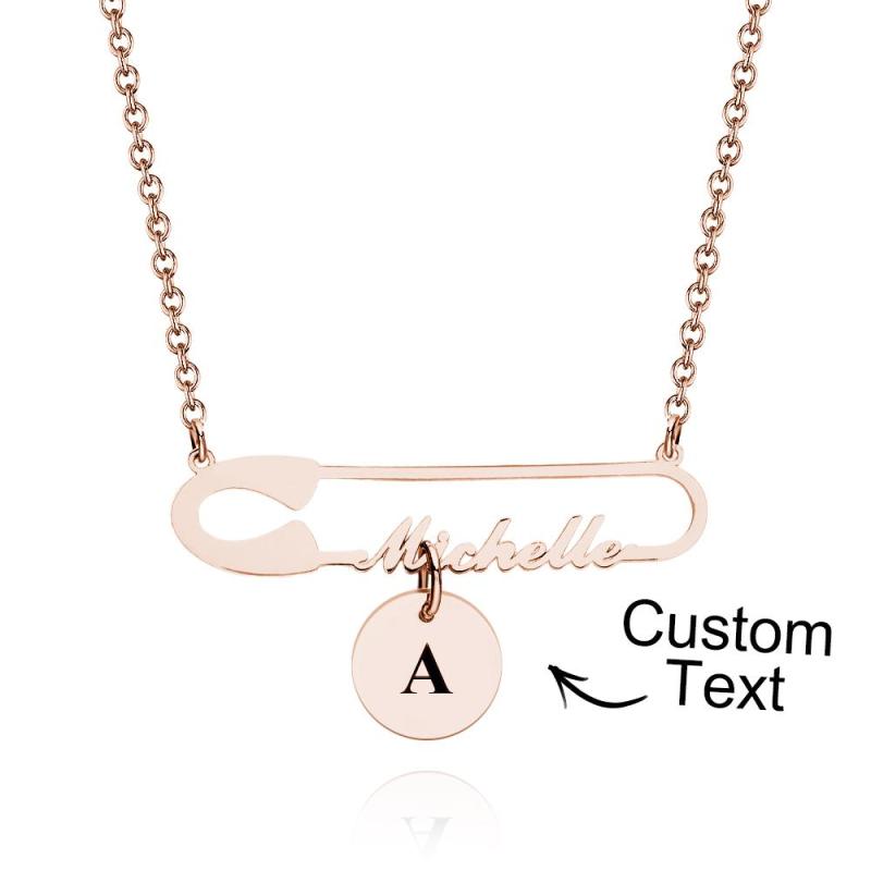 Add a touch of elegance to your style with our Personalized Text Name Necklace for Women. Crafted in a safety pin style design, this minimalist necklace is a perfect gift. With the option to customize the initials, this necklace is available in silver, gold, rose gold, and black. Upgrade your jewelry collection today.